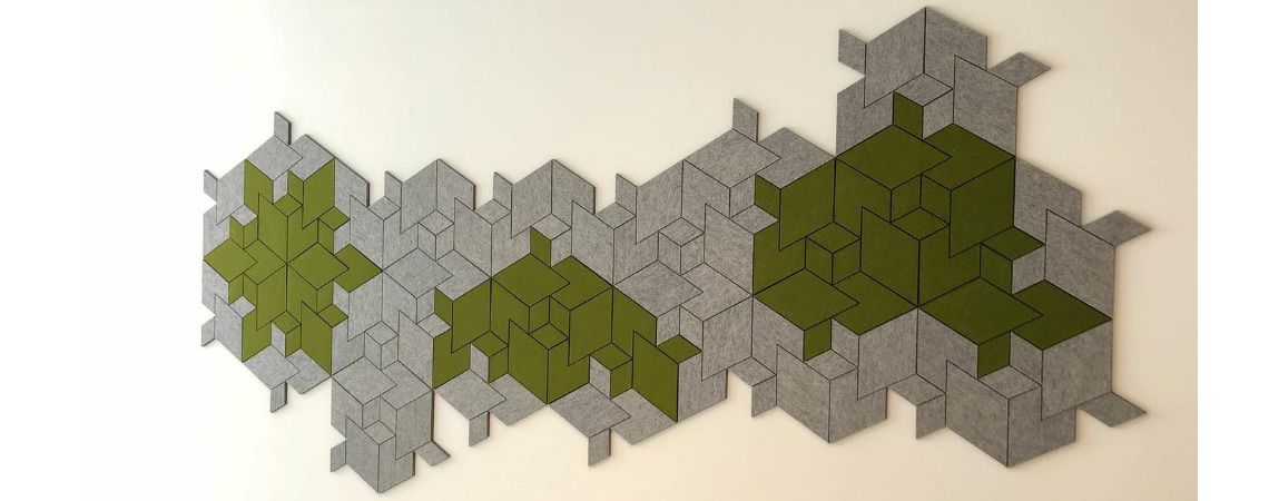 De bijzondere kleden met geometrische vormen zijn van productie uitval van de 3 grootste tapijttegel producenten van Nederland. Interface, Tarkett en Forbo. Er zijn samenwerkingscontracten met deze duurzame koplopers om de levensduur van hun uitval te verlengen. De ontwerpen van de kleden zijn geïnspireerd op M.C. Esher. Je kunt je eigen kleur, vorm en grootte bepalen waardoor elk kleed uniek is en altijd in elke ruimte past. Door het unieke kliksysteem kun je de losse tegels in elkaar klikken waardoor je volledige vrijheid hebt in jouw ontwerp.