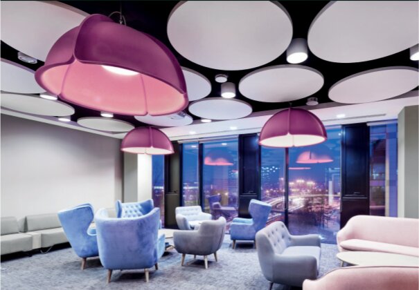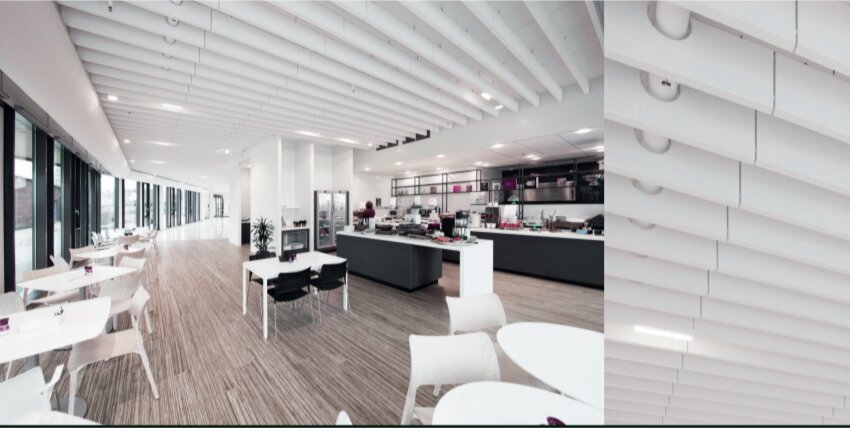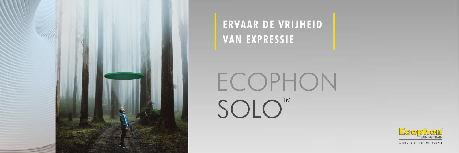 De altijd actuele en trendy Ecophon Solo biedt vrijheid van ontwerp en de mogelijkheid om opvallende nieuwe omgevingen te creëren. De vrijhangende panelen zijn allemaal 40 mm dik en verkrijgbaar in alle vormen, kleuren en maten die je nodig hebt om je artistieke ideeën in praktijk te brengen. Solo eilanden en baffles zijn een echte eyecatcher binnen de ruimte.