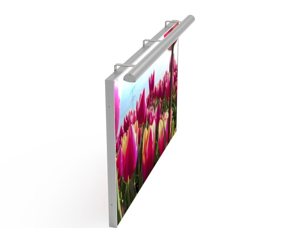 Licht bijvoorbeeld het T-Flex® 70 Outdoor billboard systeem helder en egaal uit met de SlimLine® S1 LED lichtkoof. Voorzien van solide RVS beugels, om het systeem direct aan de wand te monteren.