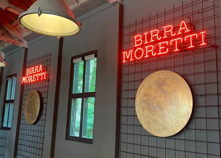 EEN NEON GLAS KUNSTWERK TREKT DE AANDACHT.