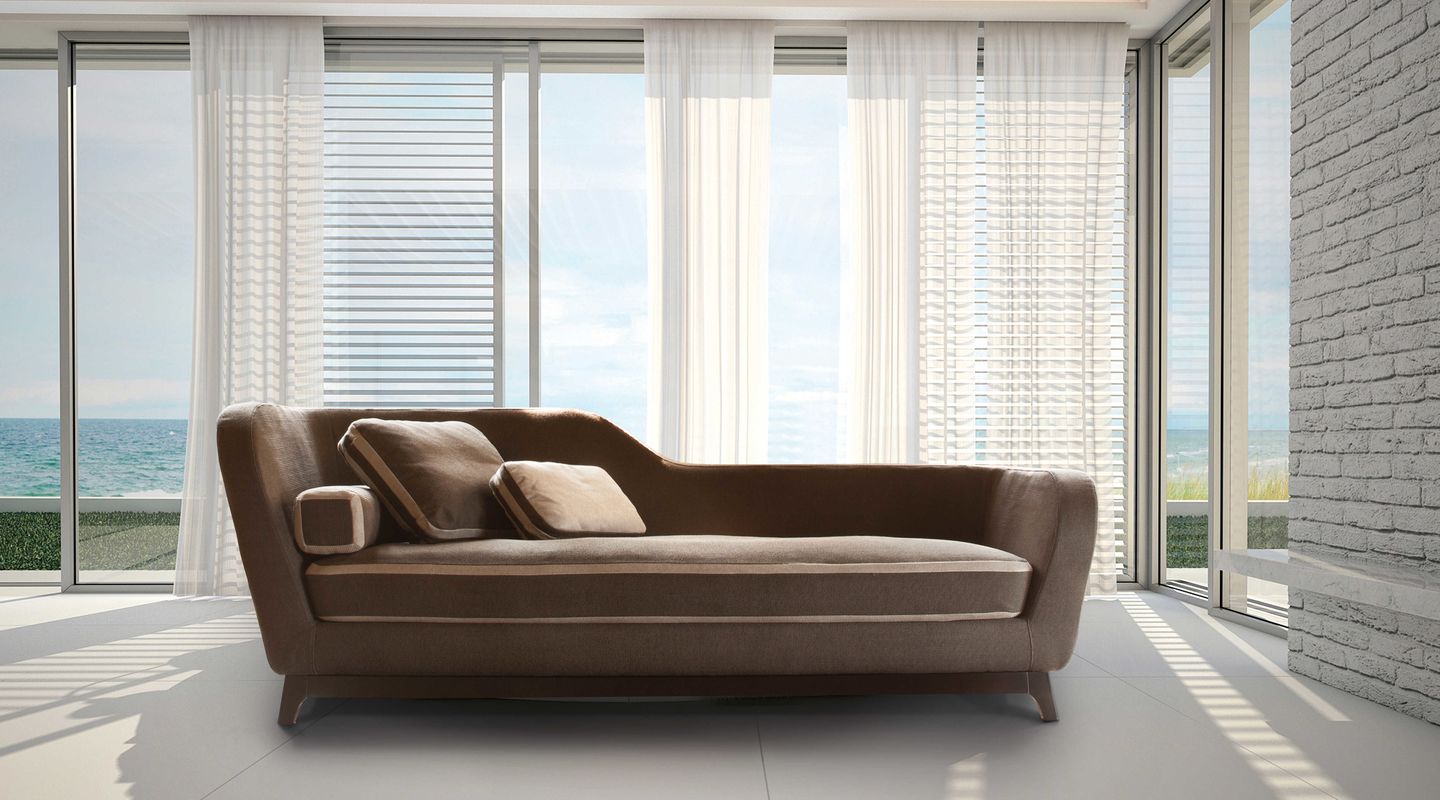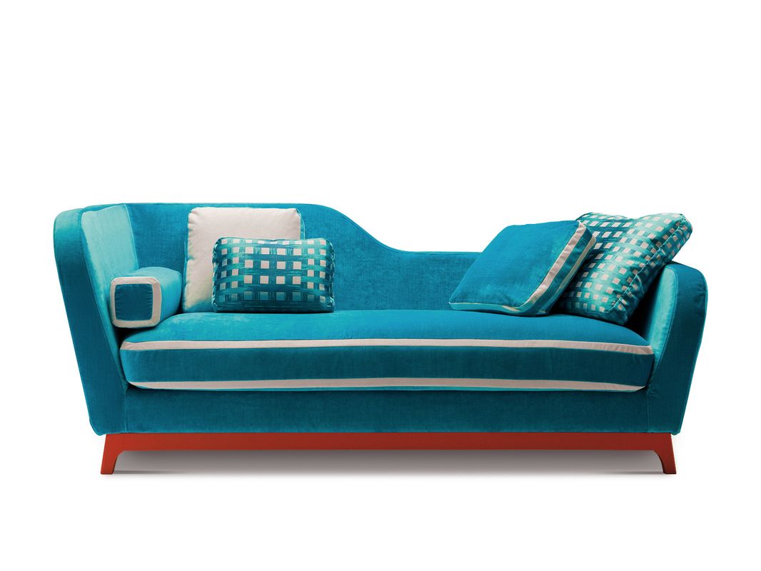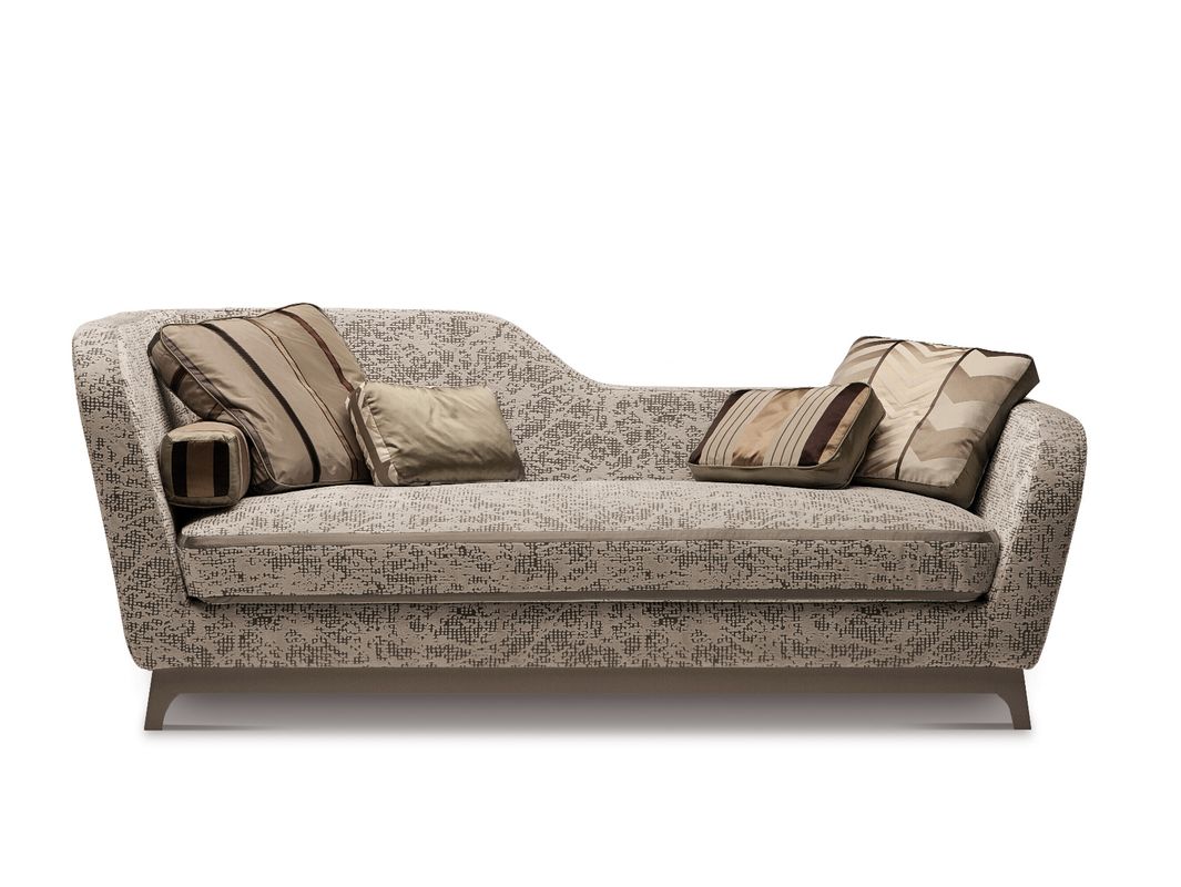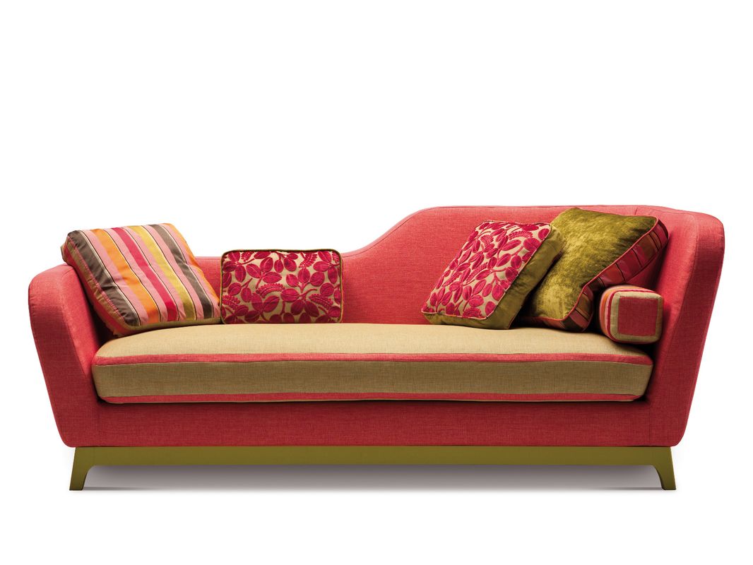 Jeremie, with its “daybed” shape, recalls the Art Deco style, played down and at the same time emphasized by its variants: “Trendy”, turquoise fabric with special white details and orange base, “Fashion”, in shades of deep pink with floral patterns and striped details and green base, “Glamour”, in elegant taupe and brown colours.