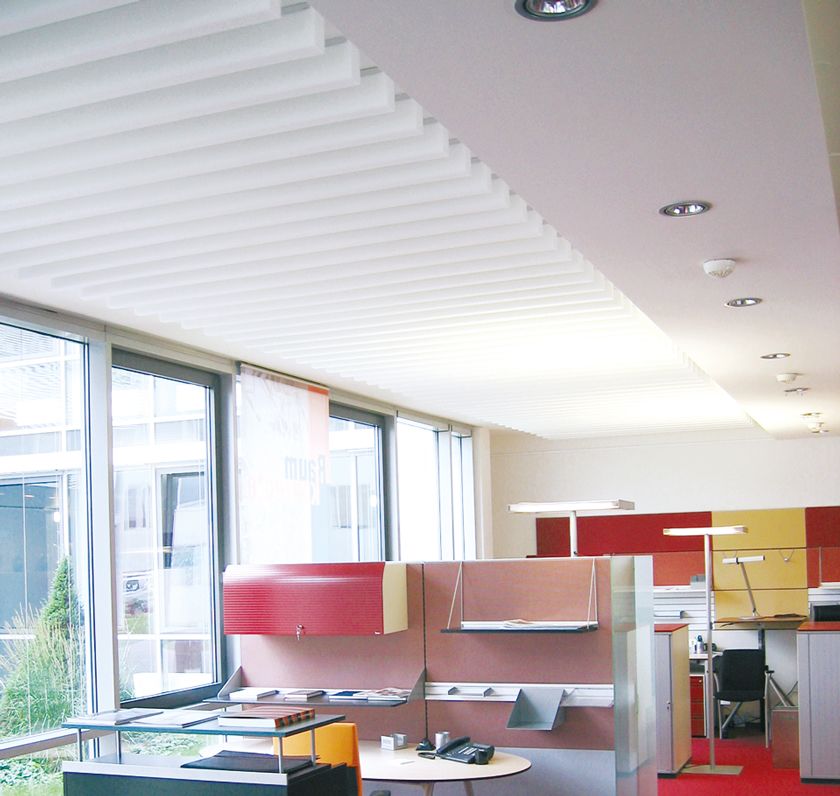 Een perfecte akoestische oplossing voor hoge plafonds zijn Linear Polar elementen. Dit zijn geluidsabsorberende ophangelementen. En ja in meervoud, want een ophangelement hangt nooit alleen. De Linear Polar elementen worden met een bepaalde tussenruimte in een rij aan het plafond gehangen. Door ze op de juiste afstand van elkaar te plaatsen worden de geluidsgolven die van het plafond weerkaatsen door het geluidsabsorberend ophangelement opgevangen en geabsorbeerd.