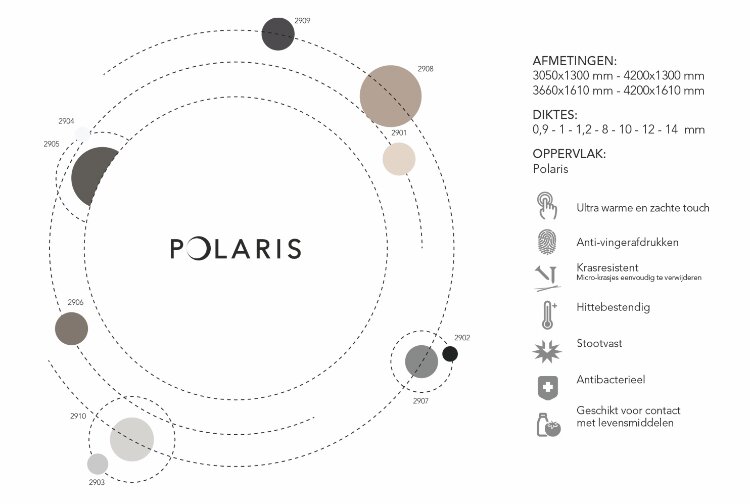 Het vernieuwde Polaris, vrucht van het stilistisch en technisch onderzoek door Abet Laminati, voelt fluwelig en warm aan en het oppervlak biedt uitzonderlijke kwaliteiten met een hoge kras- en hittebestendigheid en er blijven geen vingerafdrukken achter. De aparte combinatie van duurzaam en fluweelzacht geeft Polaris een futuristische aantrekkingskracht en biedt een perfecte keuze voor ultramoderne ontwerpen, met een unieke en aangename zintuigelijke ervaring.