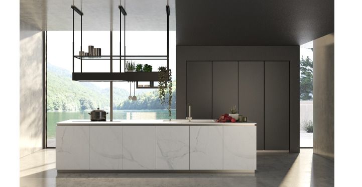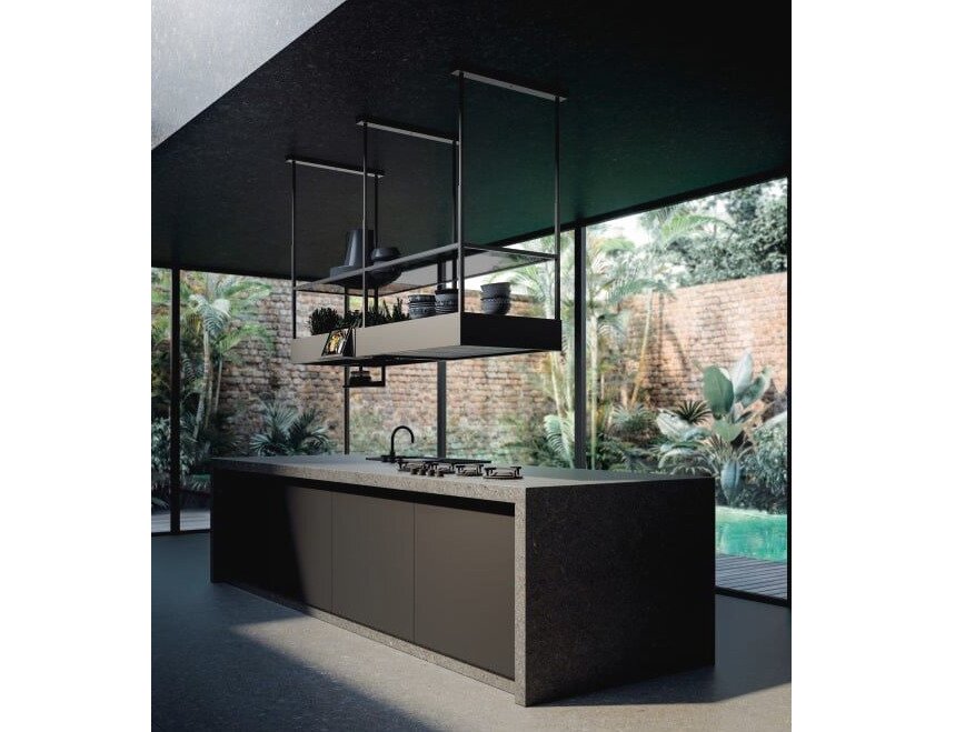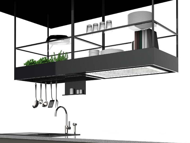 De intelligente afzuigkap Spazio is een multifunctionele draagconstructie van 180 cm voor boven het kookeiland. De recirculatie afzuiginstallatie heeft planken van matglas voor servies en ander kookgerei. De kap biedt ook de mogelijkheid om een kleine moestuin in te herbergen, die speciaal door Falmec is ontworpen voor de teelt van aromatische kruiden om mee te koken.