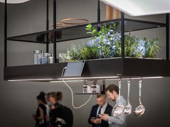 Spazio is verkrijgbaar in zwart staal of RVS, inclusief afstandsbediening, tablethouder, lepelhanger en kruidenhouder. Optioneel uit te breiden met een keukenrolhouder, bakken en lampen voor een moestuin.