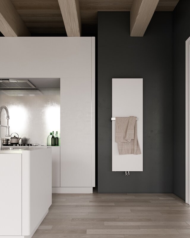 De Stretta heeft een vlakke voorkant en strak omgevouwen zijkanten, waardoor er geen naden zichtbaar zijn. Daardoor lijkt het of de radiator vrij hangt van de muur. Achter de omkasting bevindt zich een verticale dubbele paneelradiator met convectie lamellen.