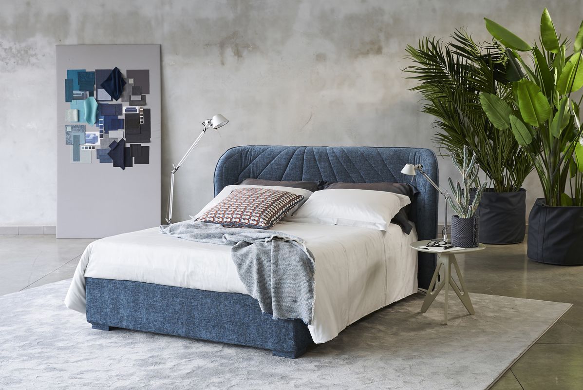 A padded bed with a quilted curved headboard, Victoria fits, with its proportions, in both modern and contemporary environments. The feet are covered in fabric and are also available in various wood and metal finishes. It is available with either a fixed slatted base or with two storage variations, one a regular storage bed placed underneath the mattress or with the "Komodo storage", which, in addition to the regular storage bed, has a practical system that raises the slatted bedstead and the mattress to ease the fitting of the bed linen. Victoria is a demountable bed for easy delivery. This bed with removable cover can be cleaned according to the fabric chosen.