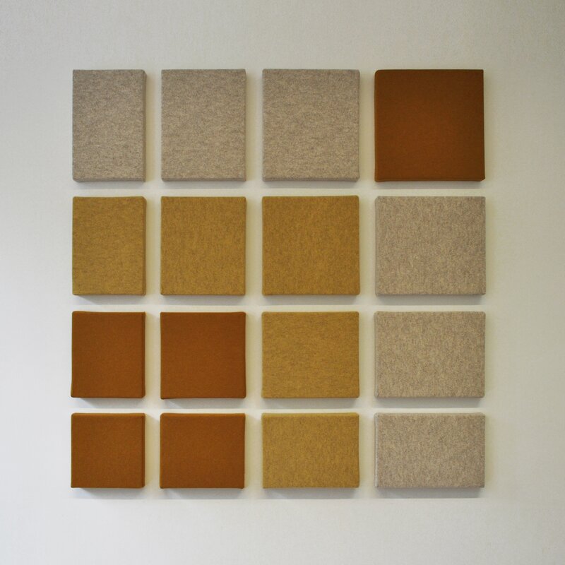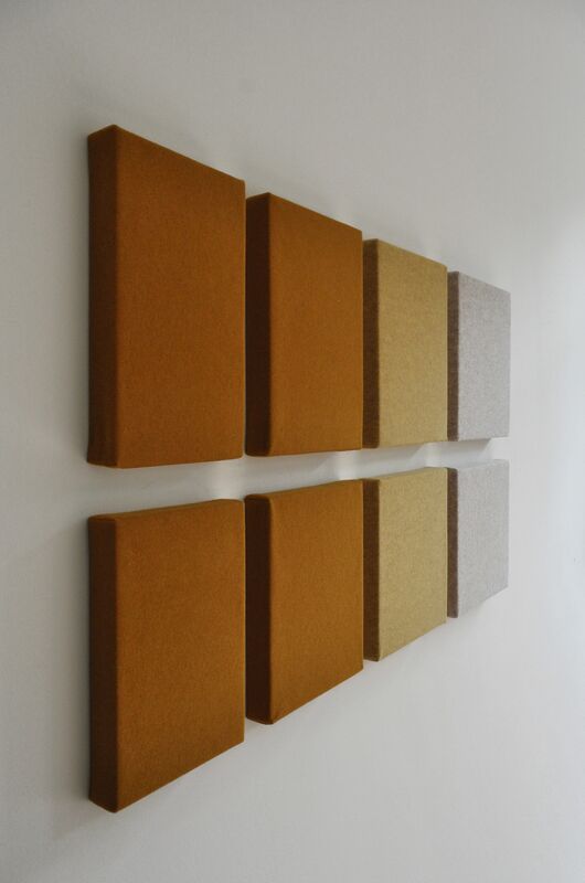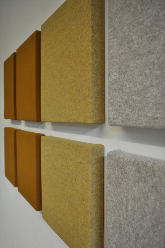 Dit is bekleed met Féline’s natuurlijk wolvilt (90% wol,10% polyester) dat is vervilt zonder water. Het wandpaneel is in totaal 52 mm dik. De geluidsabsorptiewaarde bij spraak is rond 80% en bij beltonen rond 90%.