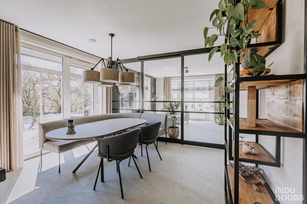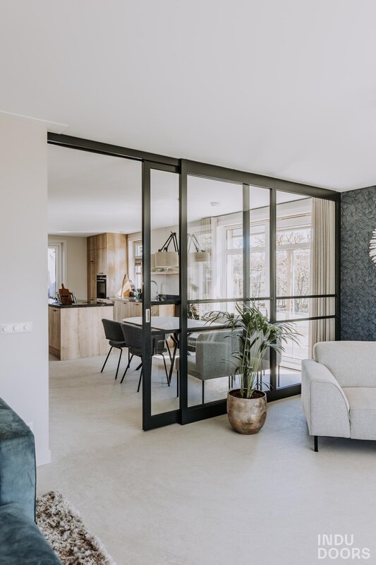 De houten binnendeuren zijn te realiseren in een RAL-kleur naar de wens van de klant. Zo ook bij dit project een antraciete schuifdeur wand in een industrieel interieur wat onwijs goed aansluit op het meubilair in de woning. De antraciete kleur van de schuifwand oogt net wat zachter dan de kleur zwart.