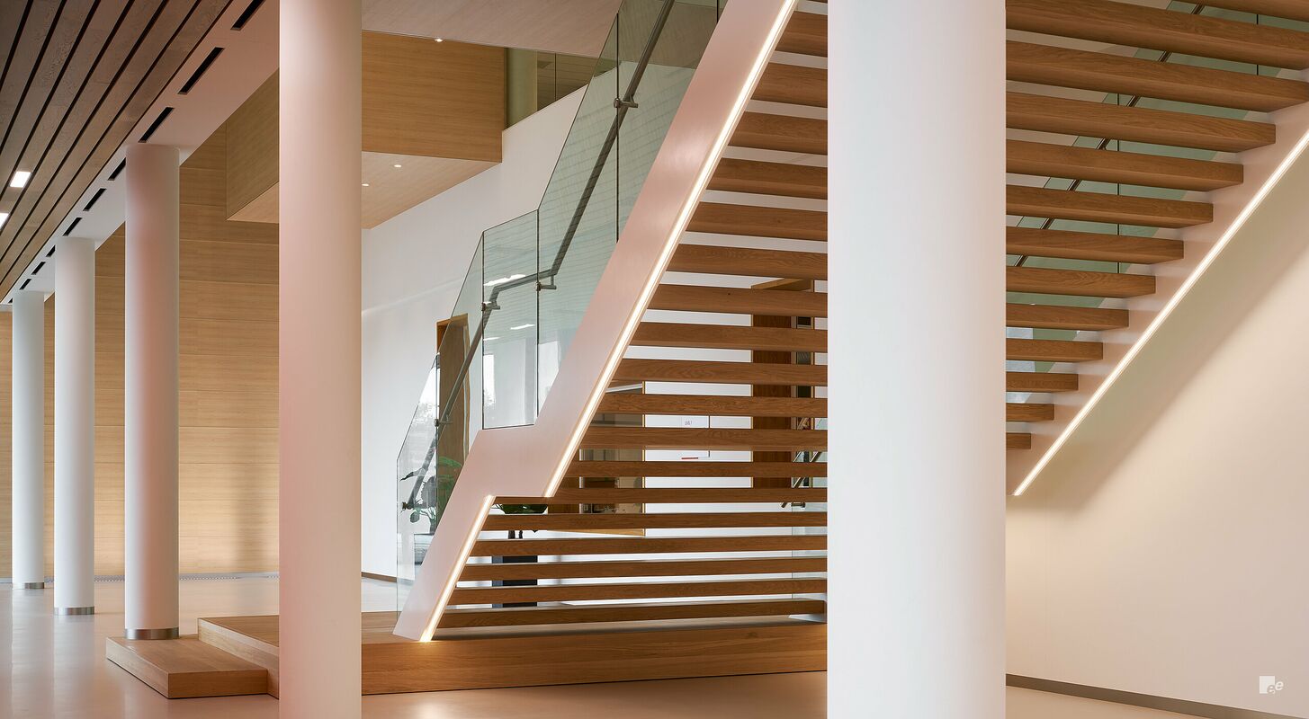 Toen Van de Poel Architecten het nieuwe energie neutrale hoofdkantoor en de productiefaciliteit van AWL, een toonaangevende internationale fabrikant van hightech machines en componenten, ontwierp, was het meest opvallende interne element een atrium van vier verdiepingen. En daarvoor waren drie lange trappen van twee trappen nodig.