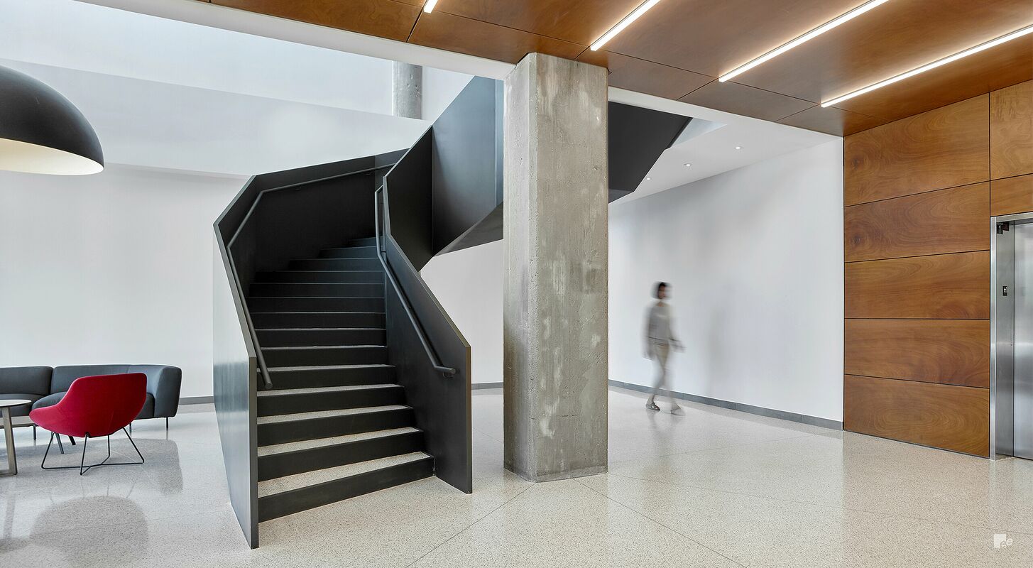 De trap die EeStairs maakte voor de herbestemde Bata-schoenenfabriek in Ontario, Canada, was ongewoon qua vorm en structuur. De ontwerpers, BDP Quadrangle in samenwerking met Dubbeldam Architecture + Design, wilden dat de trap in de ontvangsthal balustrades met gedurfde facetten en bovenlichten zou hebben - en zelfdragend zou zijn.
