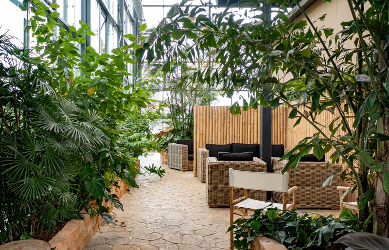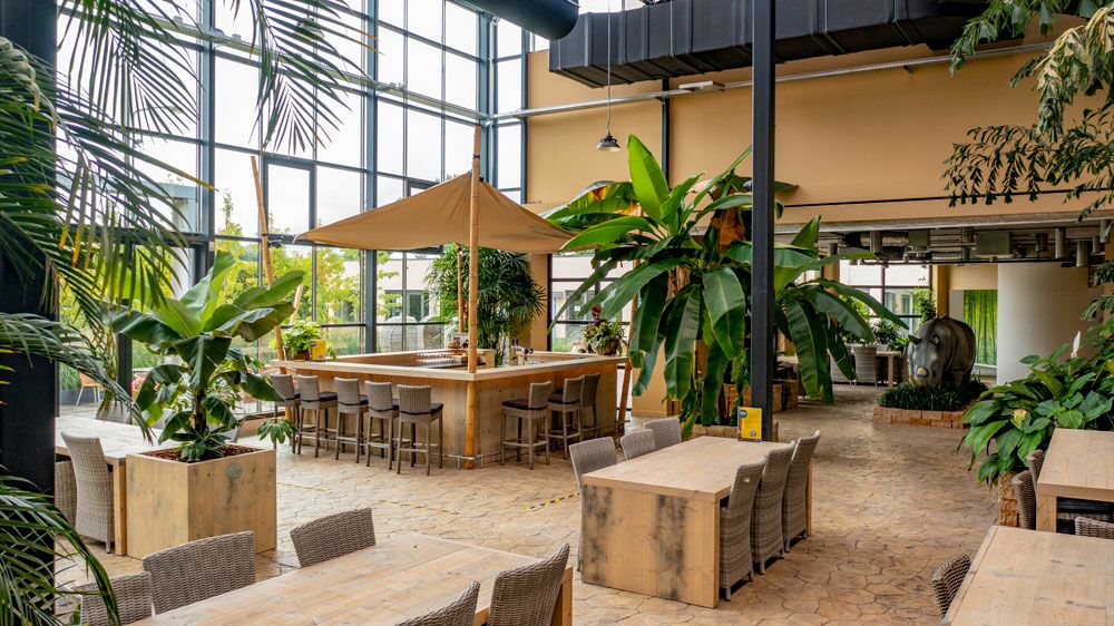 Verschillende soorten interieurbeplanting zijn geïntegreerd in het interieur zorgen ervoor dat de hele ruimte is aangekleed. Er is dan ook bewust gekozen voor meubelen die afkomstig zijn uit natuurlijke materialen.