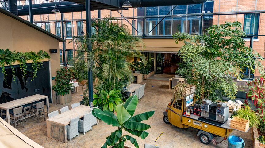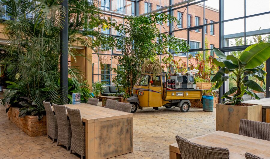 Doordat de binnentuin is voorzien van het prachtige biophilic design is de binnentuin, de ideale ontmoetingsplek voor collega's om te socializen, te vergaderen of te lunchen.