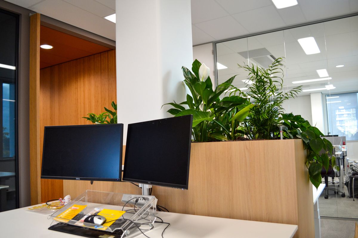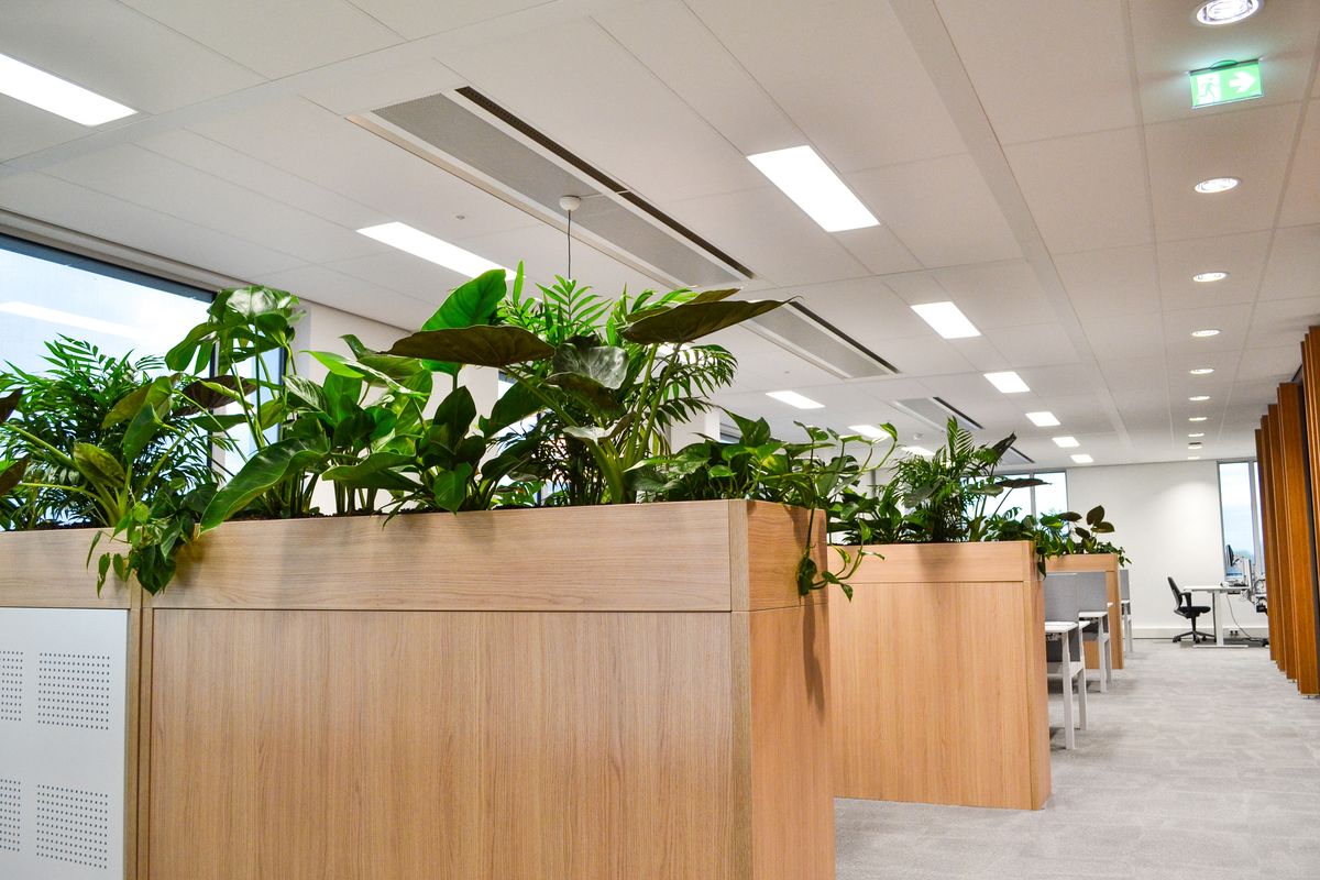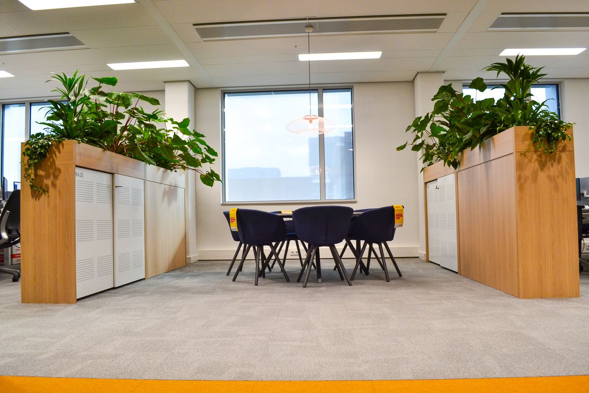 Daarnaast zijn er op iedere verdieping door middel van kasten met ingebouwde plantenbakken werkplekafscheidingen gecreëerd. Alle kasten zijn opgemaakt met een combinatie van urban jungle beplanting waardoor het kantoor een speels effect krijgt. Ook hier wordt er ruimte bespaart doordat de kantoorkasten naast opslag, de functie van een roomdivider vervullen.
