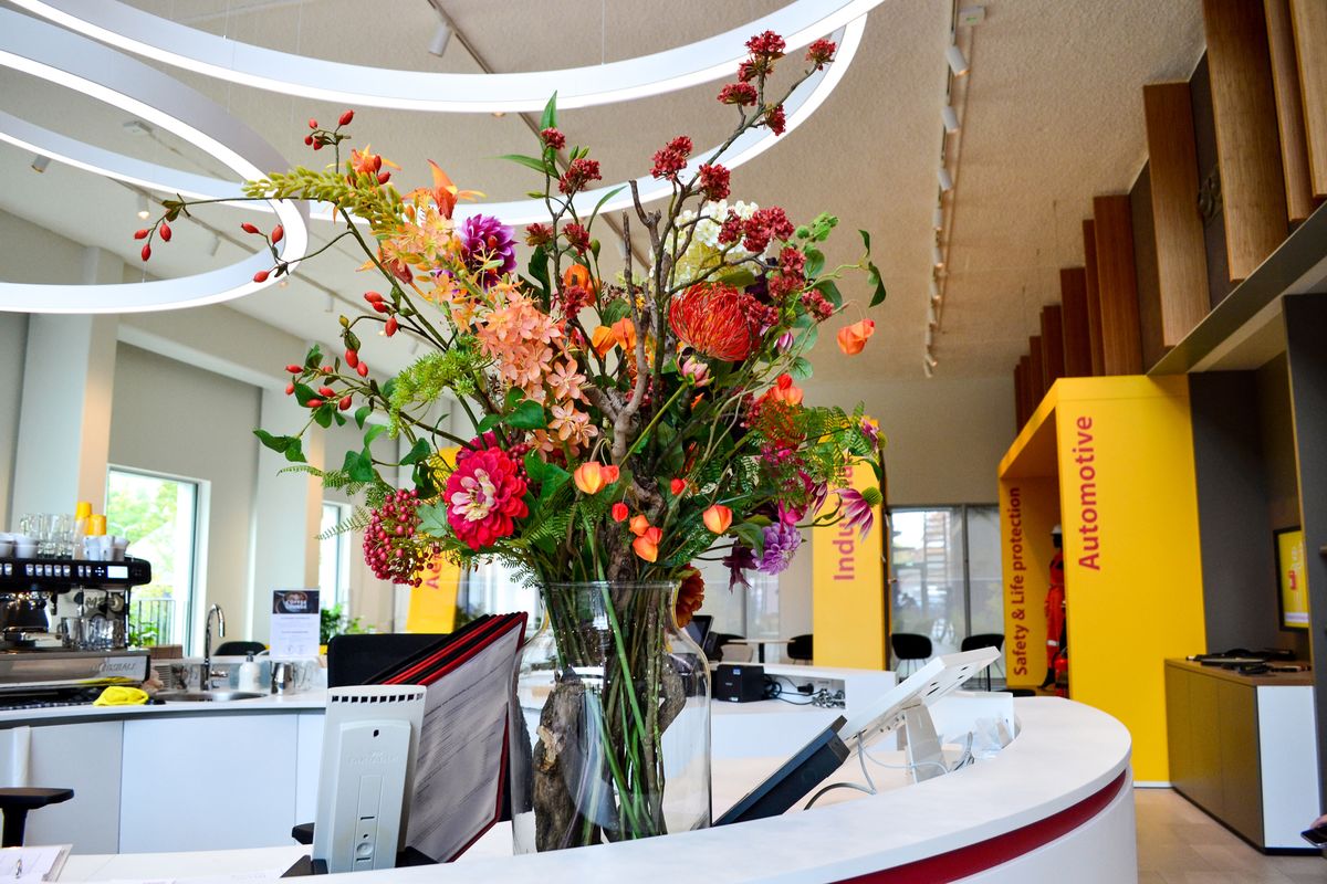 Daarnaast heeft onze styliste een prachtig sfeerdecoratie stuk samengesteld die de entree kleur en ambiance geeft. Deze kunstzijde bloemen worden elk kwartaal door ons gewisseld met een seizoensgebonden uitstraling.