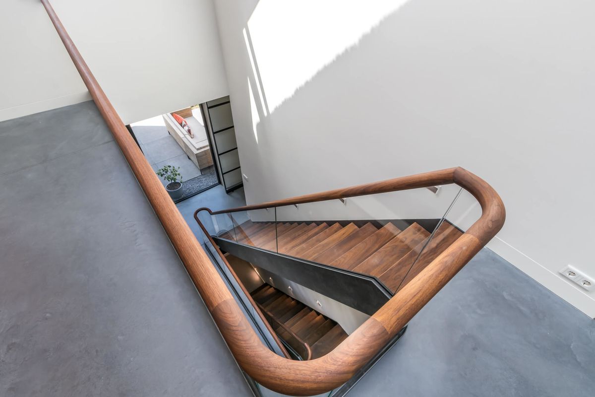 De trap en de balustrade zijn door glas verbonden. Om een mooie ronding te krijgen, hebben we het glas in twee delen verwerkt.