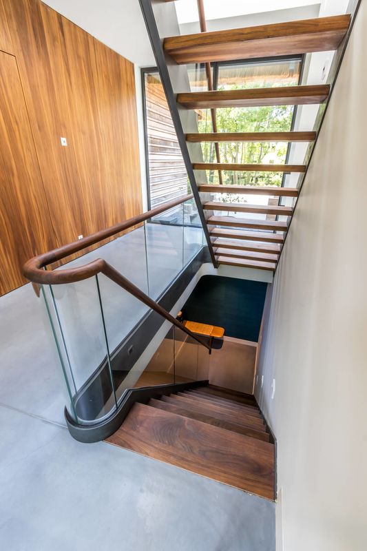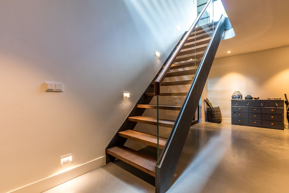 De treden en de leuning zijn gemaakt van notenhout. Een fantastische kleurcombinatie met staal.