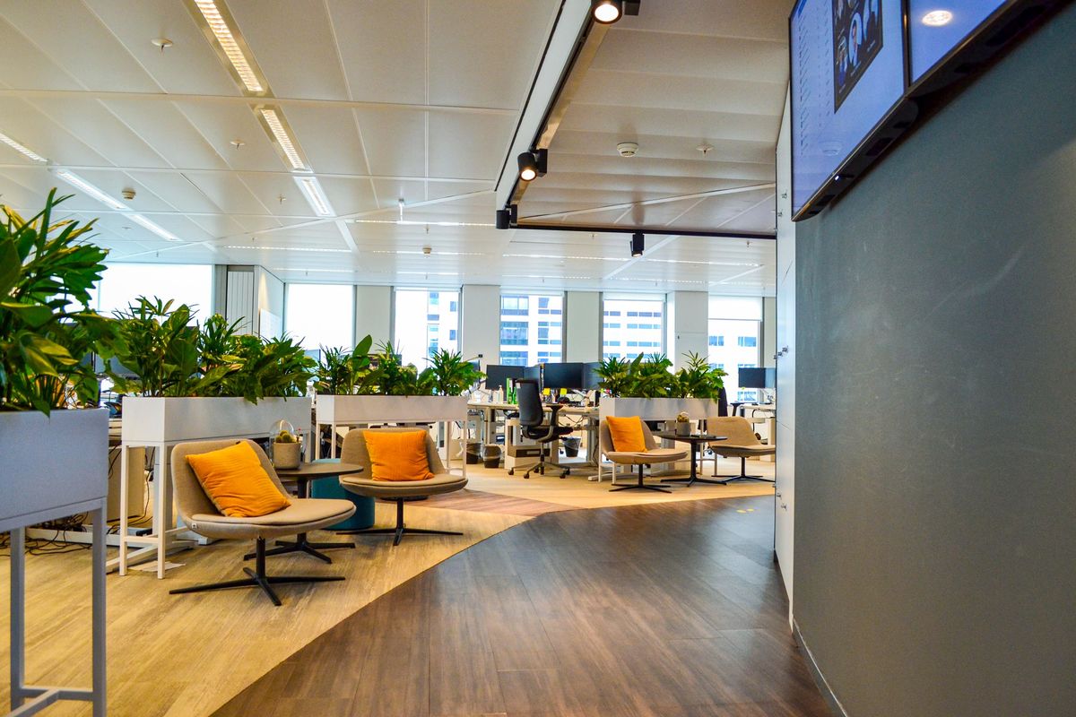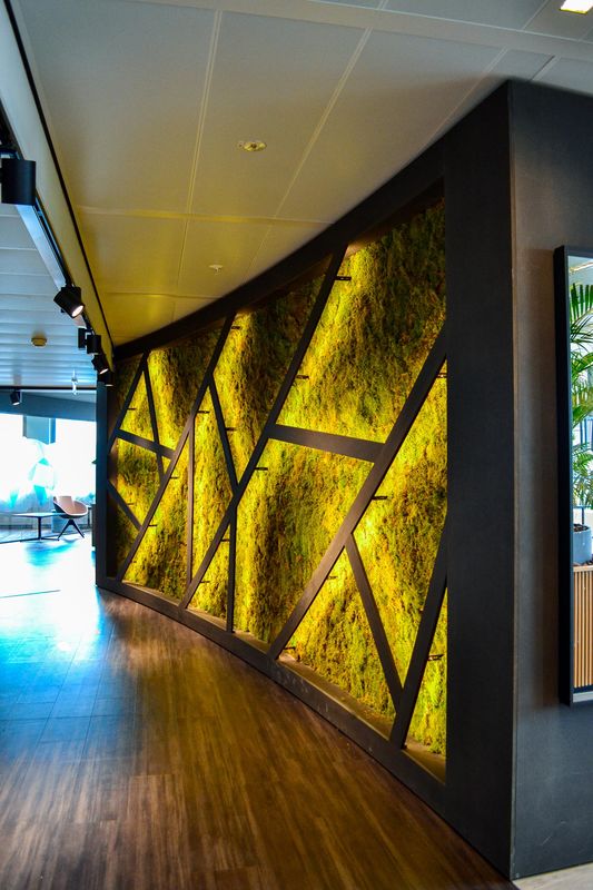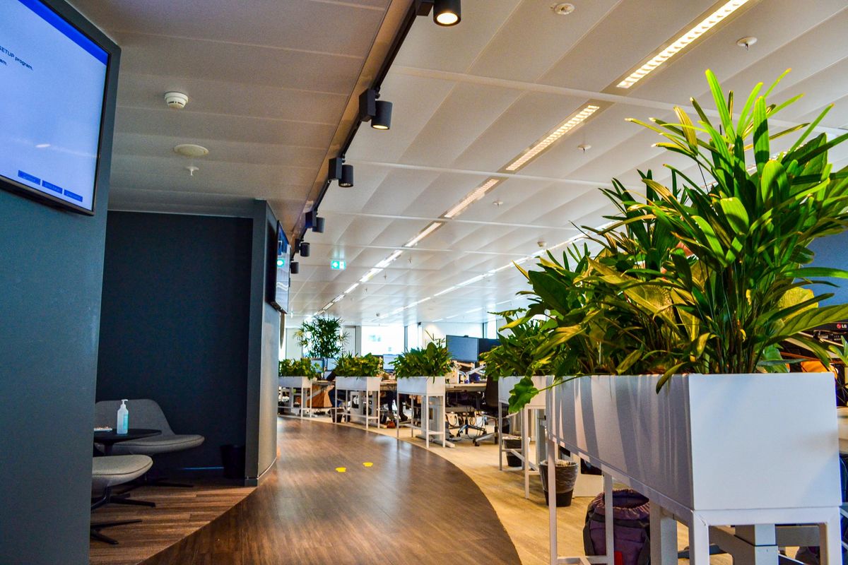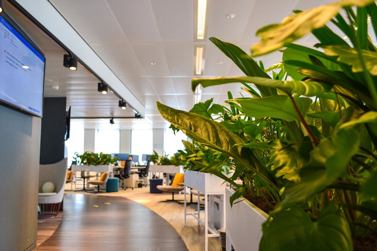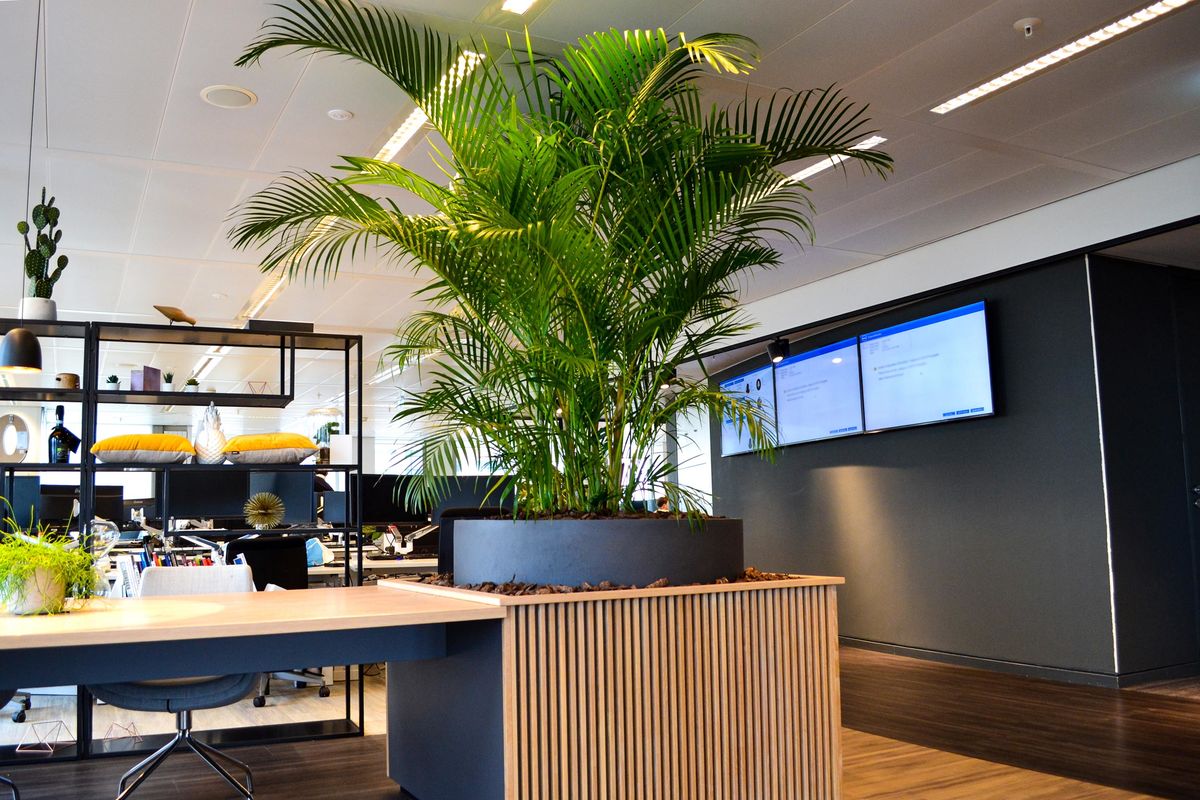 Om een optimale groenbeleving te creëren, hebben we in samenspraak met de klant gekozen voor de Grass werkplekafscheiding aan iedere kopse kant van een bureau-eiland. Hiermee wordt ook direct het looppad afgescheiden van de werkplekken. Om de interieurbeplanting nauw aan te laten sluiten op de kleurstelling in de kantoortuin zijn de dividers in dezelfde kleur wit gespoten als de bureaus. Dit creëert rust en geeft een ruimtelijk beeld. Daarnaast hebben we op drie cruciale punten in het kantoor verschillende grote beplanting geplaatst, waardoor je groen ervaart op ieder niveau en er direct een wat intiemer gevoel ontstaat in de grote ruimte. Ook de bijzondere moswand is geheel gerenoveerd door ons en zorgt voor een warme sfeer.