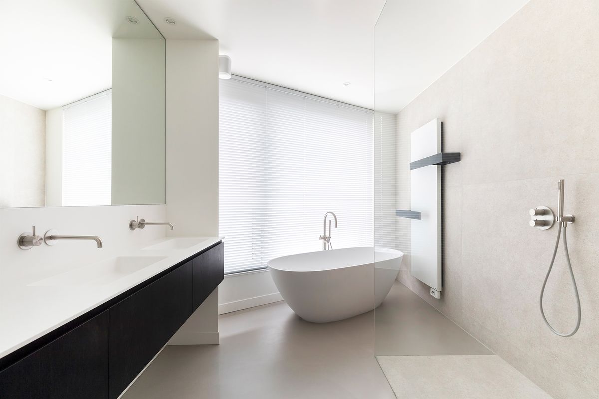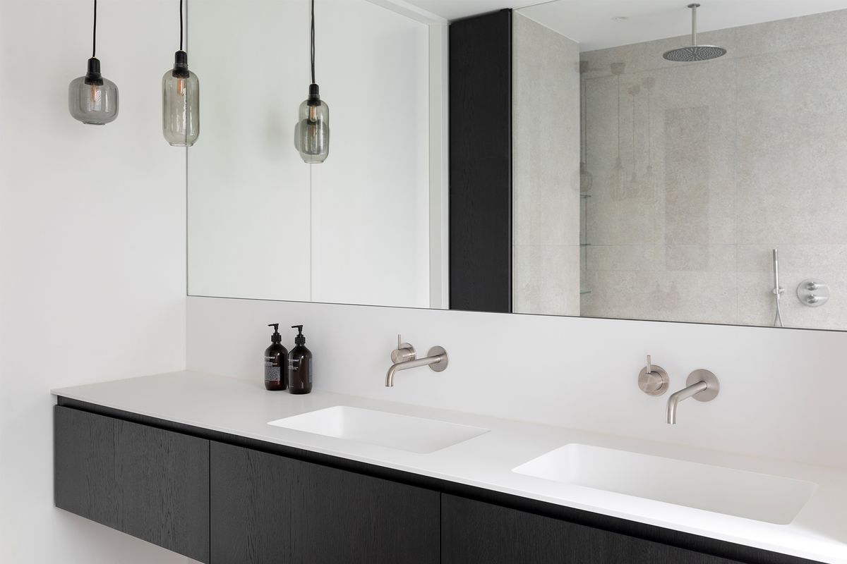 Eric en Kasper wisten wat ze wilden: een inloopdouche, een vrijstaand bad, een strakke douchewand, indirecte sfeerverlichting en grote tegels. Dat alle kranen ingebouwd moesten worden, was een uitgemaakte zaak. ‘Zowel de wastafelkranen als de thermostatische doucheset zijn strak weggewerkt in de muur. Dat vinden we mooi en rond de wastafel zorgt het ook voor meer ruimte. De wastafelkranen hebben een extra lange, sierlijke uitloop, zodat het water zonder te spetteren in de wastafel valt. De bedieningsknop van de kranen zit bewust aan de linkerkant. Als je je tandenborstel in je rechterhand hebt, kun je met je links gemakkelijk de kraan bedienen. Als je een paar keer een huis hebt gekocht, dan ga je op dat soort details letten!’