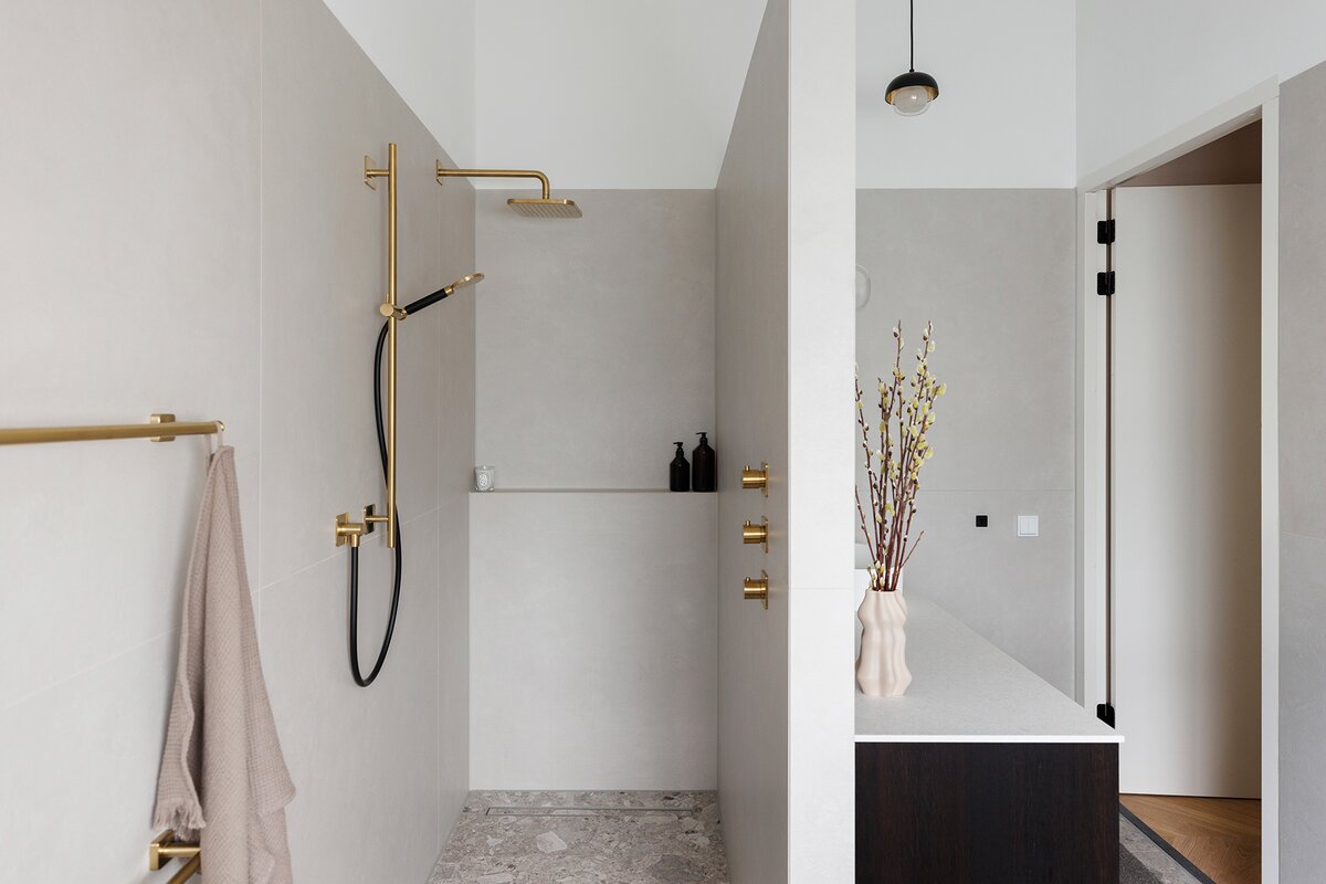 Een wens van Lotte en Rick was een grote inloopdouche. ‘Rick en ik gaan bijna nooit in bad. Ik heb er de rust niet voor. Douchen daarentegen, doen we graag. Onze douche is 1.75 meter diep en voorzien van een glijstang (GL311) met een handdouche (Cobber M353) met daarachter een regendouche (GL100). Ik noem het ook wel een luxe wasstraat’, zegt ze lachend. ‘Het is heel gezellig dat we samen met onze kinderen kunnen douchen en doordeweeks ben je dan net wat sneller. Door de handdouche op de laagste stand te zetten, kunnen de meiden er zelf onder staan. Ik sta dan onder de regendouche, al vind ik de handdouche eigenlijk prettiger. Die heeft een krachtigere straal en het is handig als je je haren niet nat wil maken. De knoppen om de douches aan en uit te doen, zitten vooraan in de inloopdouche. Zo word je nooit nat, net als de kranen.’