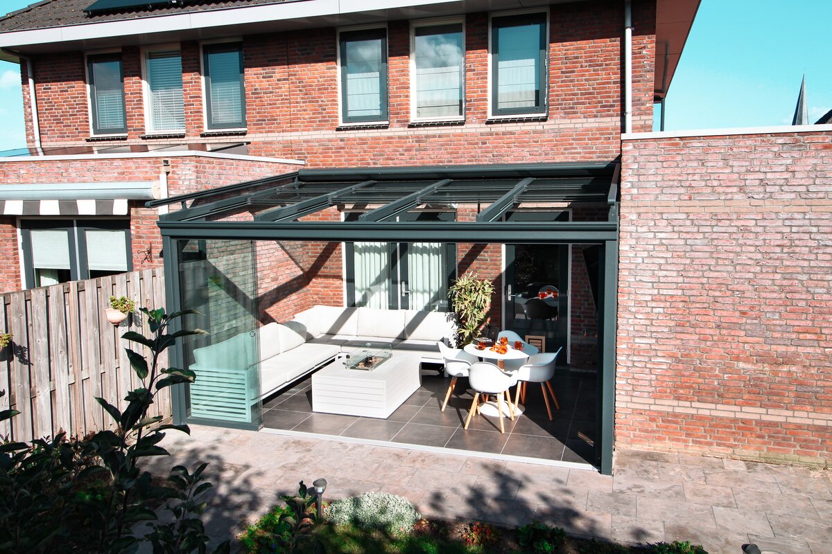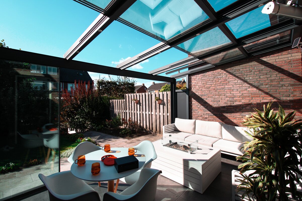 Er is gekozen voor het meest flexibele, transparante dak van Ittalum. Een glazen schuifdak. De 4 segmenten kunnen voor 75% worden geopend. De warme lucht die naar boven stijgt, kan de tuinkamer aan de bovenkant verlaten. De glazenwasser kan bij de bovenwoning komen, doordat de trap gewoon tegen de gevel aan gezet kan worden. Met een bovenglaszonwering creëren we een luchtlaag tussen het glas en de zonwering. De zon wordt hiermee zoveel mogelijk tegengehouden en de lucht krijgt nog de kans om te circuleren voordat hij het glas bereikt. Door de schuifwand aan de voorzijde is het een volledige tuinkamer geworden. Met het schuifdak en schuifwand open en de zonwering naar beneden, is het heerlijk in de schaduw. Door de tuinkamer iets voorbij de zijgevels van de reeds bestaande aanbouwen te trekken, blijft het ruimtelijke gevoel aanwezig. Dit ruimtelijke gevoel wordt helemaal versterkt omdat de schuifwand in zijn geheel van glas is en het zicht op de tuin behouden blijft.