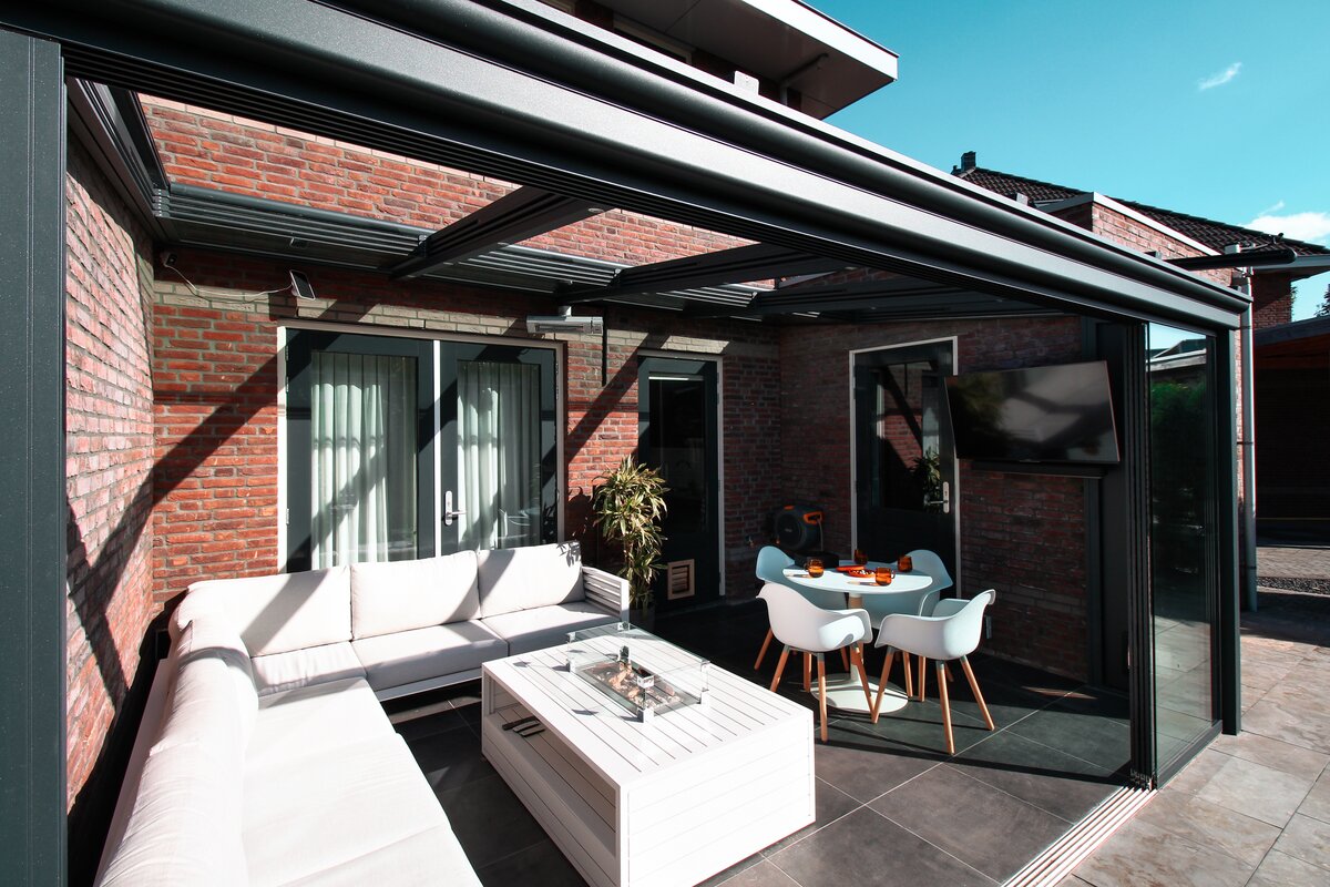 Deze tuinkamer zit ook vol slimme apparatuur. Dit schuifdak wordt namelijk elektrisch aangestuurd door motoren en is te bedienen met een afstandsbediening. De led-verlichting is duurzaam en dimbaar om de juiste sfeer te creëren. Met en zon- en windmeter gaat het zonnescherm automatisch uit bij een bepaalde temperatuur. Deze slimme technieken zijn ook op afstand (vanaf een app op uw telefoon) bedienbaar met een domoticaysteem. In dit geval heeft de bewoner dit zelf op zijn domoticasysteem ingesteld en kan hij zelfs de heater met zijn app besturen.