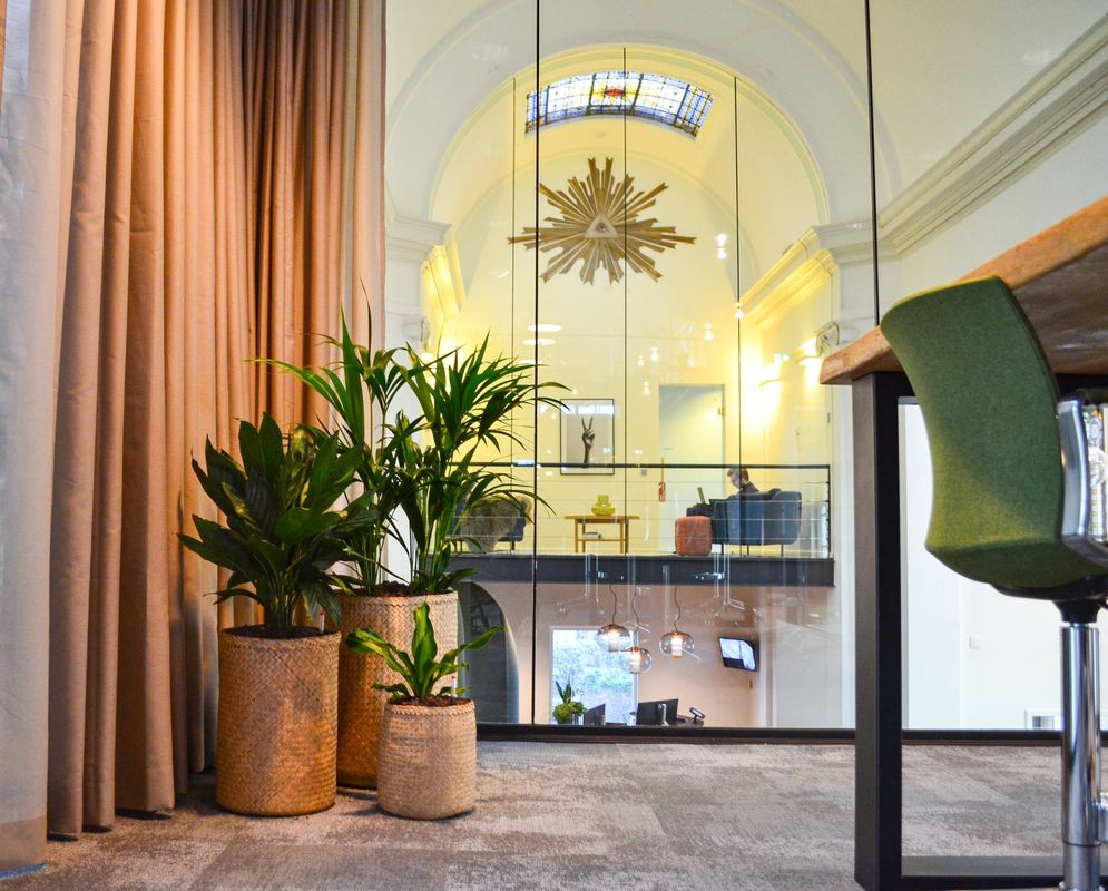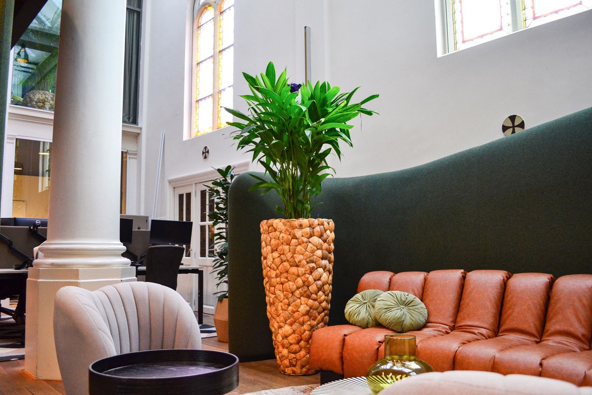 De kerk is door slimme oplossingen verbouwd tot een prachtig, functioneel kantoor. Karlien heeft met haar voorliefde voor natuurlijke materialen, kleuren en vormen warmte in het kantoor gebracht. Samen zijn we op zoek gegaan naar groenoplossingen, zoals plantenbakken met een natuurlijke uitstraling, om het ontwerp extra kracht bij te zetten. In dit project is er dan ook bewust gekozen voor een verscheidenheid aan materialen, waaronder papier-maché, seagrass en kokosnootschalen.