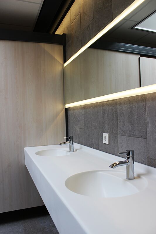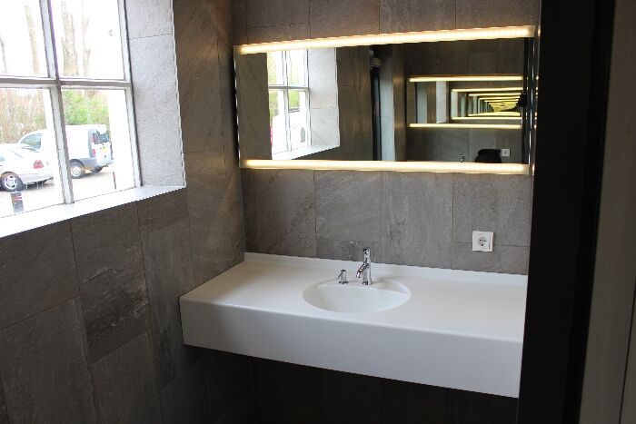 Ook de Marlan wastafelbladen passen zeer goed in het geheel. Deze zijn uitgevoerd in model Alpha, kleur Blossom White.