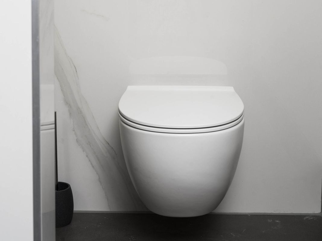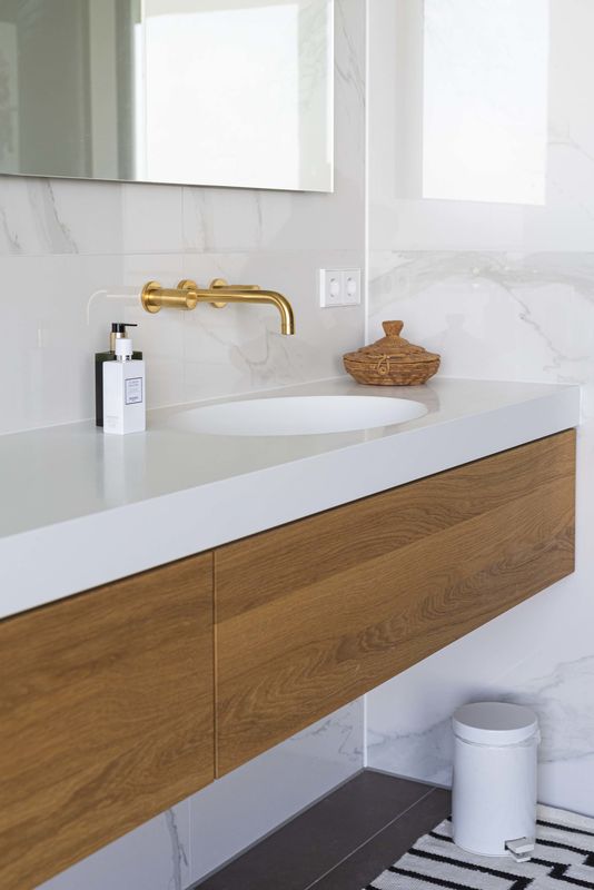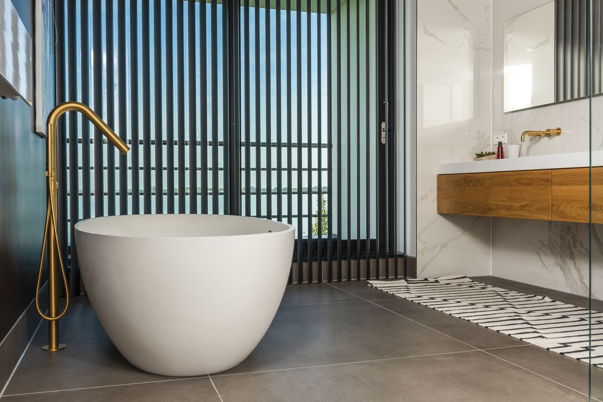 Moderne badkamer in een vrijstaande luxe villa met minimalistisch sanitair en marmeren tegels gerealiseerd door Luc van den Berg Tegels & Sanitair. Sanitair geleverd door Luca Sanitair met o.a. wand wastafelmengkraan, inbouw doucheset en vrijstaande badmengkraan in geborsteld goud van Bongio. Open toiletruimte met een mat wit wandcloset van Globo en marmer look.