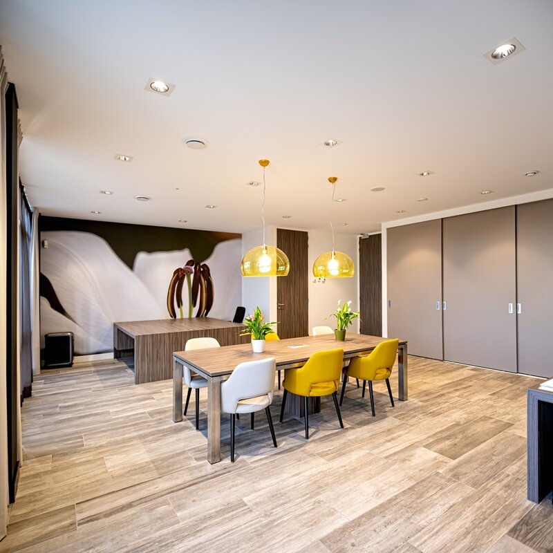 Vanwege de goede ervaringen met de ledverlichting in zijn eigen kantoor legde hij contact met Leo van Aken van Klemko Techniek, producent van Lumiko ledverlichting. Van Aken: “Goede kwaliteit verlichting is een essentieel onderdeel van het ontwerp. Voor de schuine plafonds van de kantine hebben we gezocht naar een maatwerkoplossing.” De spits toelopende daken zijn voorzien van een spanplafond, aangelegd door Schouten Spanplafonds, en verbeteren de akoestiek van de ruimte. Van Aken vervolgt: “De plafonds hebben een bijzondere vorm en functie en hier konden geen doorsnee armaturen in, anders zou iedereen recht in de schuin stralende verlichting kijken. Wij hebben ons assortiment Lumiko Modulair gebruikt om een maatoplossing samen te stellen van kantelbare vierkante armaturen met een dim to warm ledspot erin. Zo kunnen de spots recht omlaag stralen en creëert men naar wens een intiemere sfeer door de verlichting te dimmen.”
