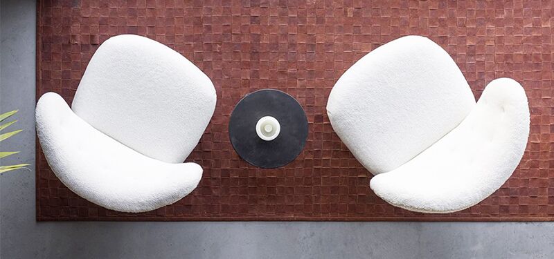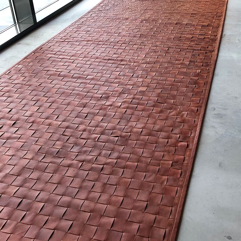 The effective use of leather is of great importance to NAHKA. Playing around with cut-offs off our cushions and zooming in onto the plain weave pattern which is the basic technique of fabric making, Carpet KUTOA was born. The patina of the leather strips give a subtle array of different shades & hues that reinforce the contrast and 3D texture.
