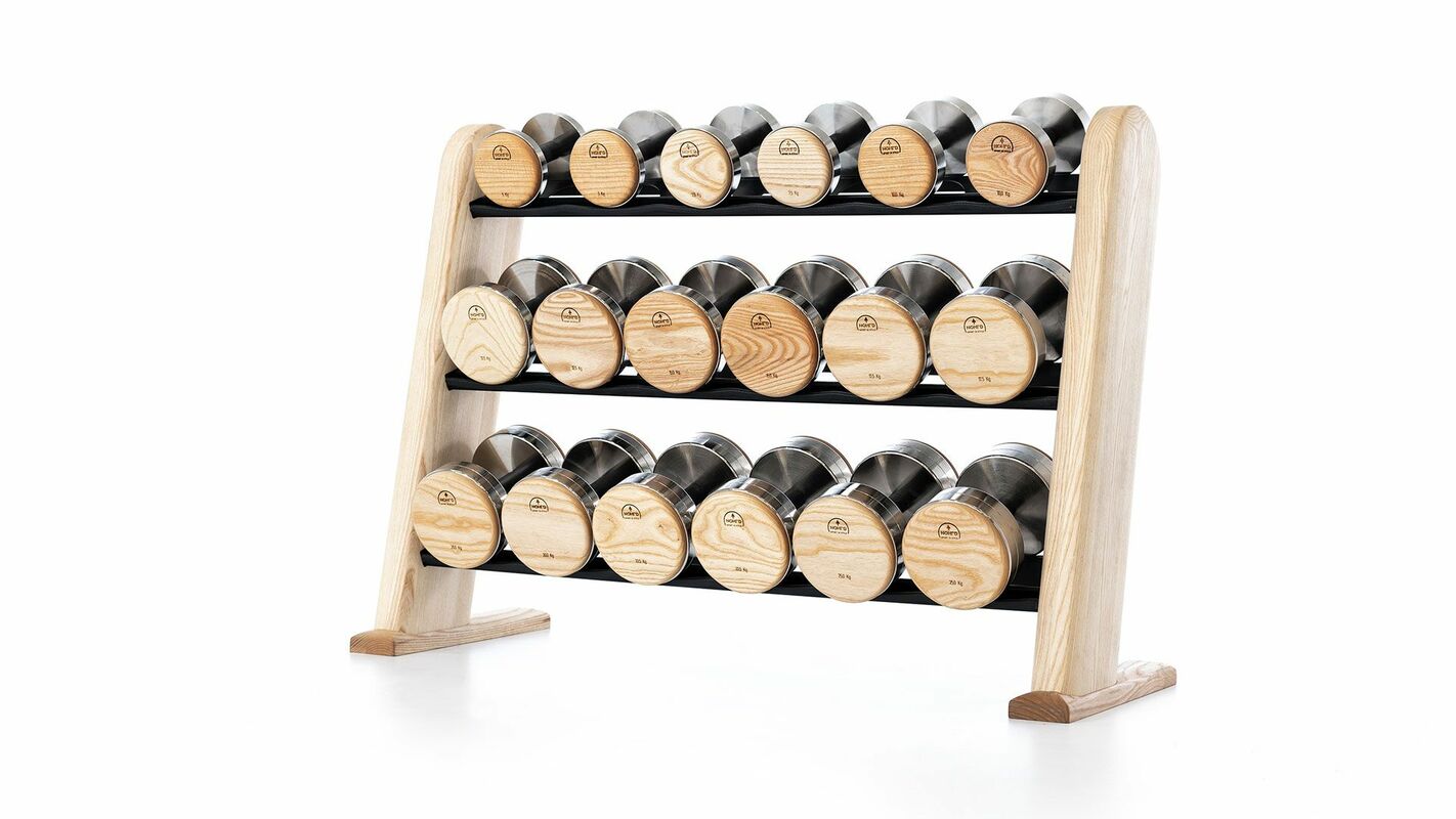 De NOHrD Dumbbells zijn samen met het Dumbbell-Rack verkrijgbaar in het complete NOHrD hout assortiment. De halters en het rack hebben zowel een slank als elegant ontwerp: de diameters van de halters worden uniform gehouden in elk gewichtsbereik, terwijl het gebogen massief houten frame van het rack niet alleen is ontworpen om ruimte te besparen, maar ook om heel stabiel te zijn.