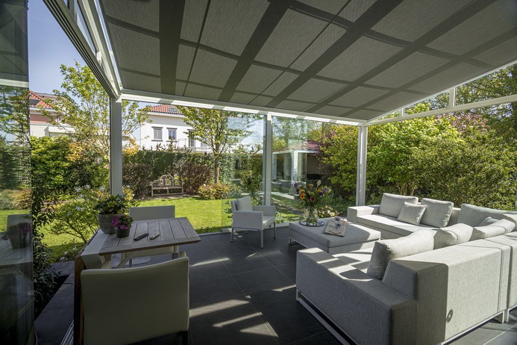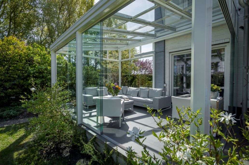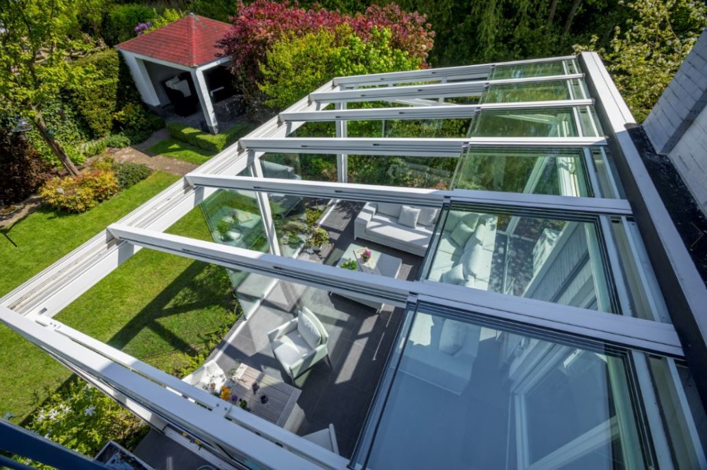 Doordat het unieke glazen daksysteem open geschoven kan worden, kan de naar boven gestegen warme lucht, meteen de tuinkamer weer uit. Dit dak wordt aangestuurd door twee motoren. Hierdoor is het mogelijk om de ene helft dicht te laten en de ander open. Het glas laat heerlijk veel licht binnen en alles is open of dicht te zetten. Naast de kleuren die aansluiten op de stijl van het huis, zijn er nog een aantal persoonlijke toepassingen gedaan aan de hand van technische snufjes. Er hangt een heater met soundbar. Via een app kunnen de bewoners op afstand (handmatig) de zonwering in en uit laten. De fundering zorgt ervoor dat de tuinkamer op zijn plek blijft; via een trapje kom je in de lagergelegen (inmiddels als gezakte) tuin.