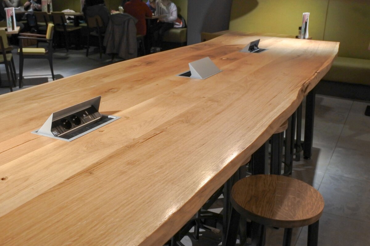 OCS heeft bij een bekende keten van weg- en warenhuisrestaurants tafelunits geleverd. Deze stijlvolle inbouw tafelunit (Bachmann Coni) is in verschillende tafels van bekende restaurants gemonteerd. Zo kunnen de bezoekers hun laptop of smartphone opladen en zo rustig verder werken.