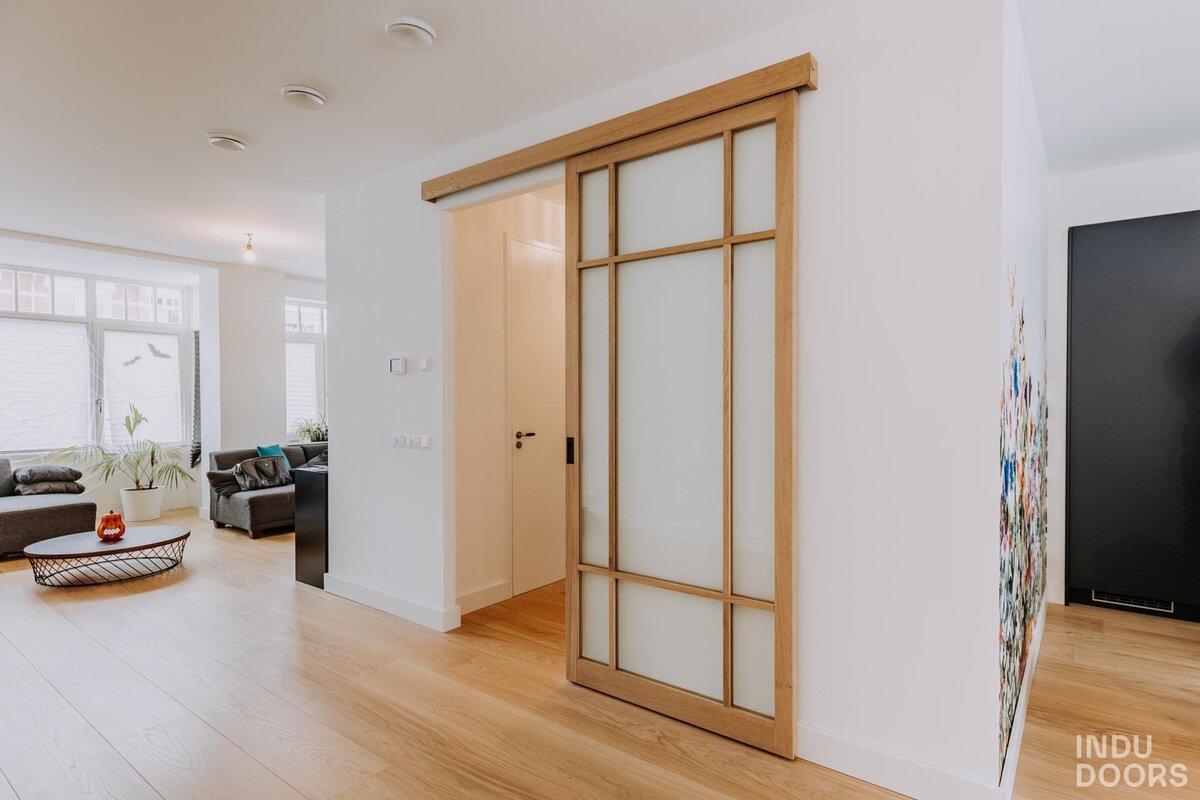 Er is hier gekozen voor model ‘London’ als schuifdeur. Deze schuifdeur heeft een muurbevestiging, waardoor de binnendeur voor de muur schuift. Als de schuifdeur open is, blijft de prachtige deur nog steeds in het zicht. Zo blijft het altijd een mooi geheel wat ook bij dit project zorgt voor een praktisch en warm effect.