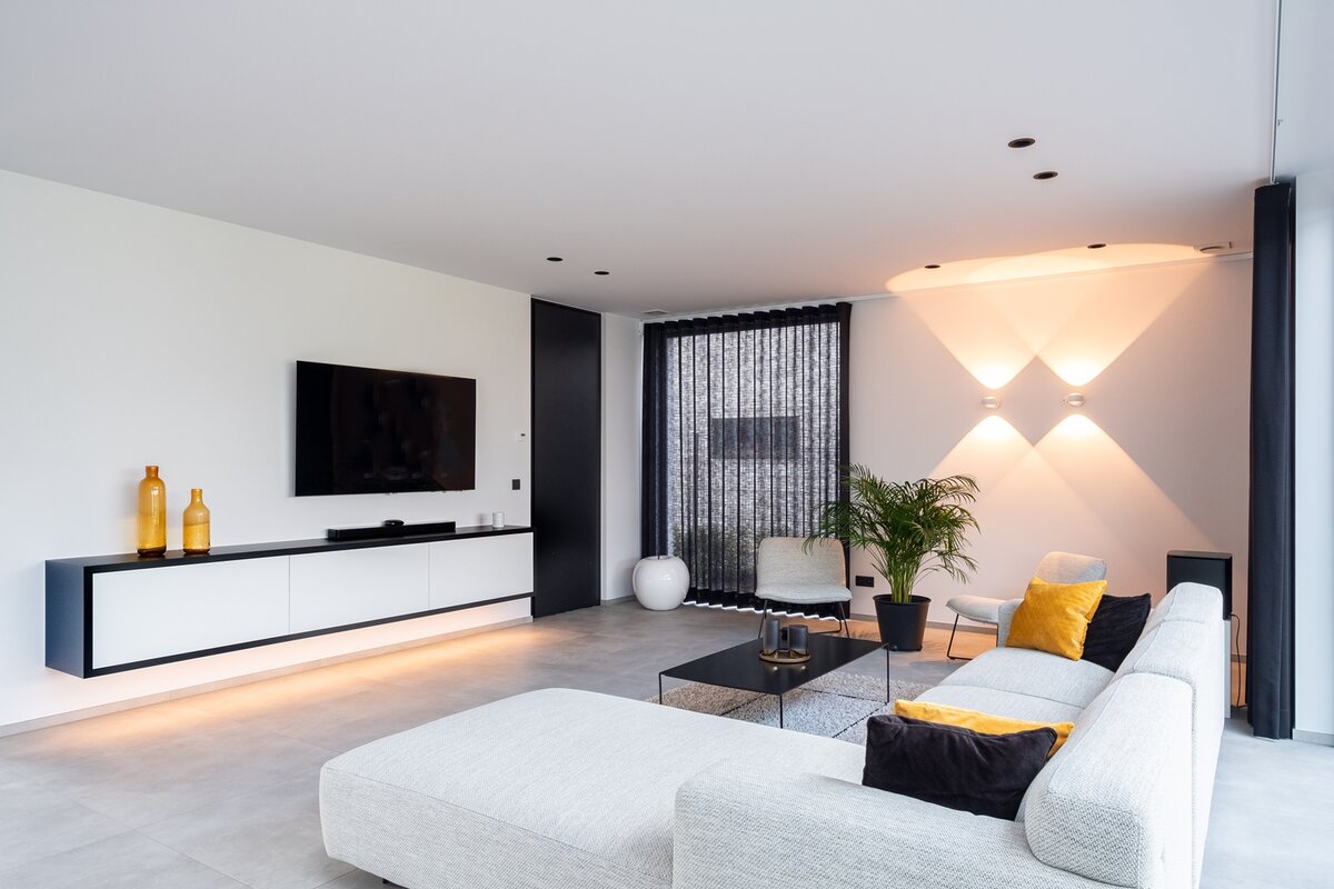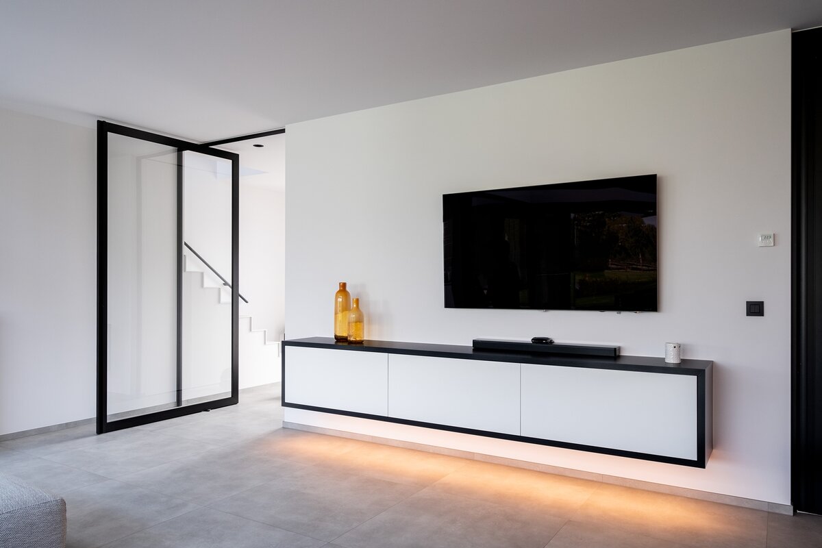 In deze moderne woning werd een strakke taatsdeur in onze populaire steel look uitvoering geplaatst als "room divider" tussen inkom en woonkamer; in combinatie met verschillende zwarte binnendeuren voorzien van verticale geïntegreerde aluminium randgrepen en minimalistische blokomlijstingen als deurkozijn.