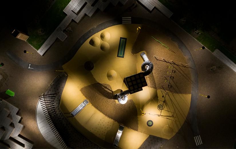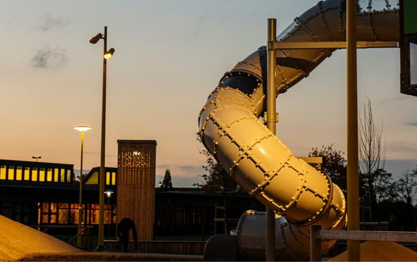 De uiteindelijke oplossing bestond uit een combinatie van Place-parkarmaturen en Wax-spotarmaturen. Beide lenen zich uitstekend voor dit doel. De palen en armaturen zijn speciaal in het geel geverfd (RAL-1023) om in het speelterrein op te gaan.