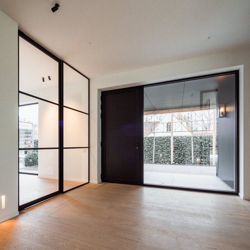 Alle deuren van Anyway worden gemaakt van geanodiseerd aluminium. Qua kleuren bieden we zwart, naturel en een speciale geborstelde messing finish aan. Het profiel van de taatsdeur is 75 x 30 mm en de vaste wanden worden gemaakt met een 30 x 30 mm profiel. De onderverdelingen op het glas kunnen volledig naar keuze bepaald worden en worden bovenop het glas verlijmd.