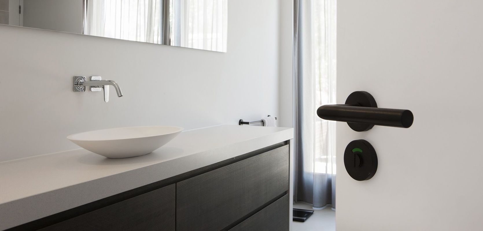 Een jaren 60 bungalow verbouwd tot comfortabele levensloopbestendige woning. Het resultaat is een duurzame, comfortabele en moderne woning met veel licht. Om een warme uitstraling te creëren is er gebruik gemaakt van de kleuren lichtgrijs en antraciet in combinatie met ebbenhout. Daarom is er voor deze bungalow gekozen voor deur- en raambeslag met een minimalistische uitstraling en een warme touch. De eenvoud en de strakke lijnen van het structuurzwarte deur- en raambeslag uit de Living Black collectie past precies binnen dit concept. Doordat het beslag niet alle aandacht opeist is er een mooie samenhang ontstaan.