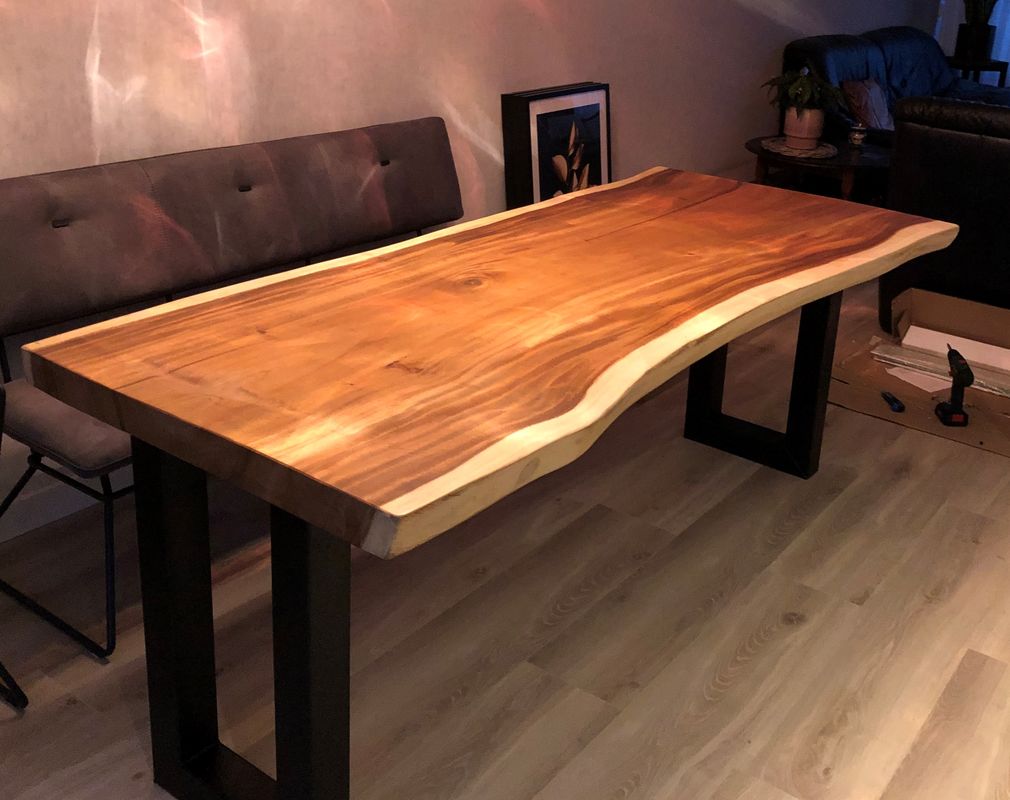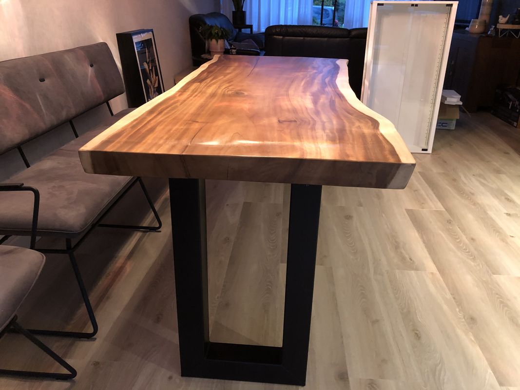 Elk boomstamblad is uniek en daarom is elke tafel uniek. De tafels kunnen in 3 verschillende afwerkingen gemaakt worden. vernis, mat of ultra mat.
