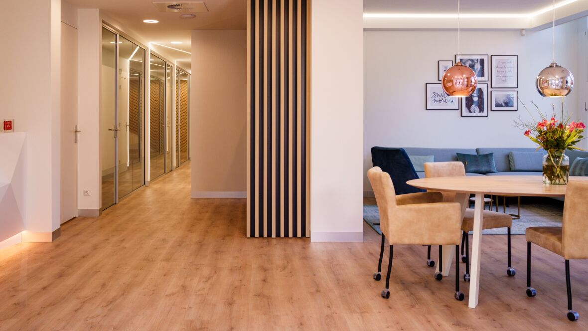 Het oude en karakteristieke ronde pand van tandheelkundige kliniek The Smile Gallery in Voorburg is volledig verbouwd en straalt mede door de vloerkeuze rust, vertrouwen en gastvrijheid uit. De combi van Eternal white marble met Eternal tropical beech maakt het pand chic zonder kitscherig te worden. Daarnaast zorgt met name de tropical beech voor warmte en geborgenheid - het huiskamergevoel - en da’s belangrijk voor The Smile Gallery, dat geen patiënten kent, maar gasten. De renovatie inclusief het ontwerp werd gedaan door specialist Rodenburg Zorgoplossingen uit Veenendaal.