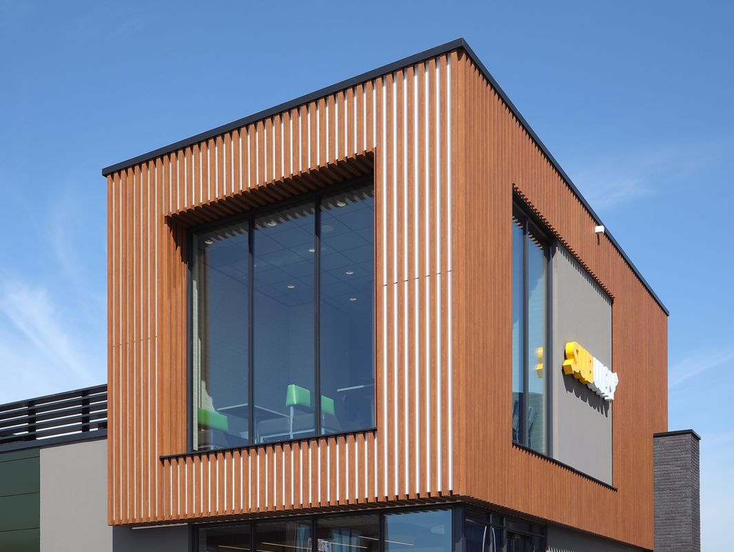 Het sublimeren van aluminium was ook een oplossing voor de Foodcourt locaties in Amersfoort en Zwolle, twee projecten van Koninklijke Jongeneel. In eerste instantie was het de bedoeling om houten profielen te gebruiken voor de gevels, maar dit bleek erg arbeidsintensief te zijn en niet het gewenste resultaat op te leveren. Toch bleef hout de gewenste uitstraling.