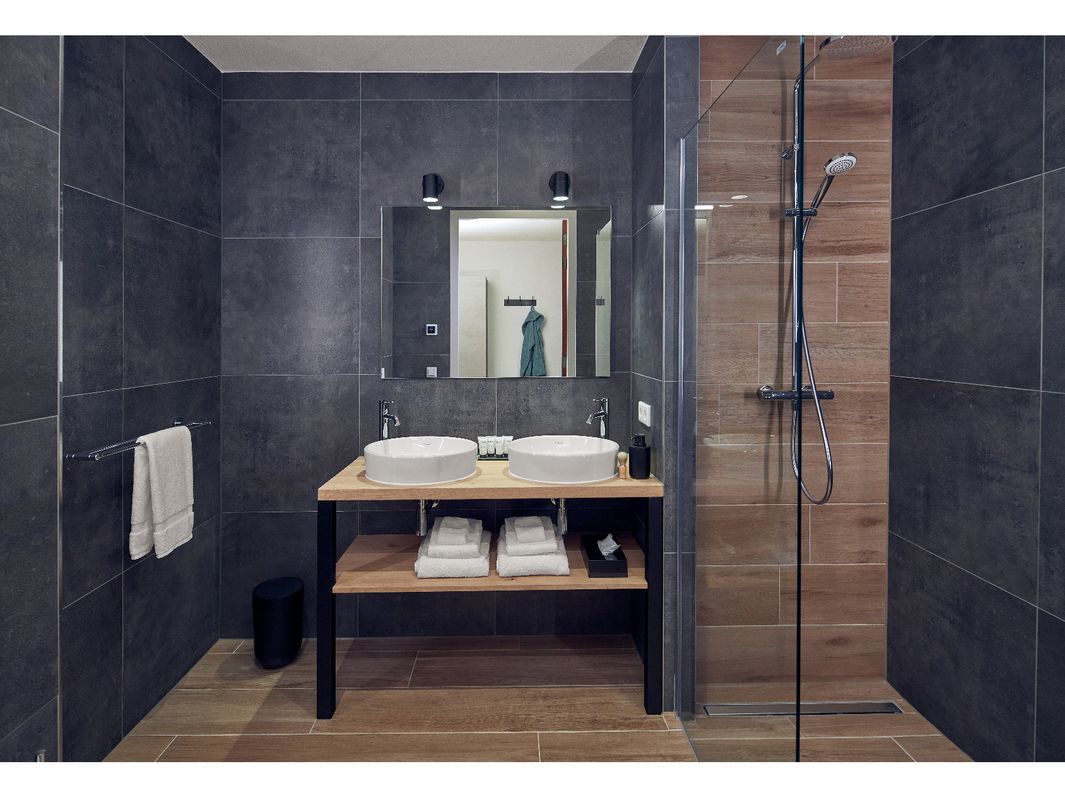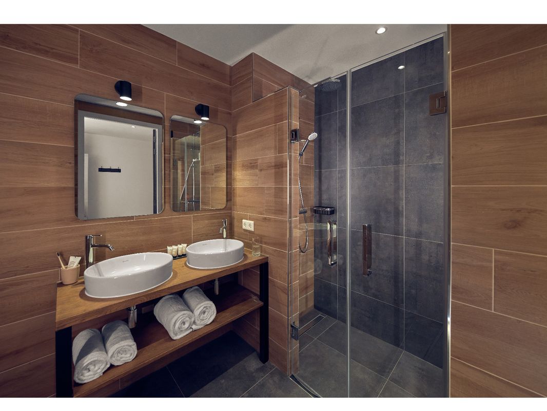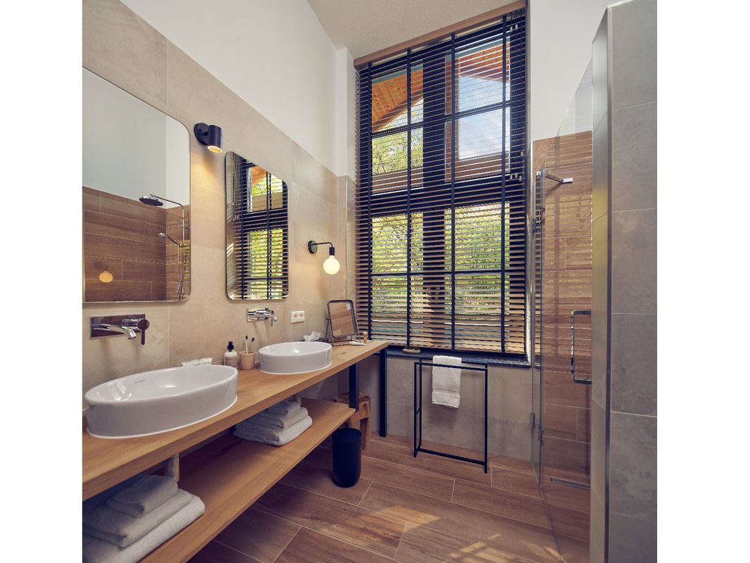 Bij de inrichting van de badkamer werd gekozen voor het sanitair van Duravit. Voor de wastafel meubels werd gekozen voor XBase en DuraStyle, deze werden gecombineerd met de Starck 2 waskommen en de DuraSquare waskommen. Durasquare is vervaardigd uit DuraCeram®. Dit keramische materiaal maakt het mogelijk om wastafels met buitengewoon dunne randen te creëren.Voor de kranen van zowel de wastafels als de baden en douches werd gekozen voor de C.1 serie kranen. Ook voor de toiletten koos men voor Duravit, het Durastyle Basic wandcloset. Door deze producten van Duravit te combineren met verschillende tegels en accessoires ontstonden 21 unieke badkamers.