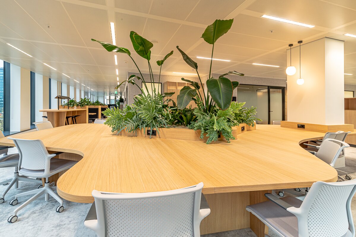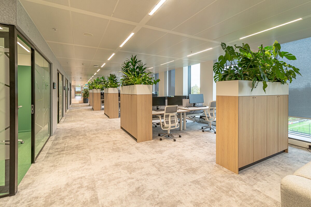 Van vergadertafels met levendige beplanting tot kasten met groene accenten bij werkplekken. Op maat gemaakte bakken met jungle beplanting rondom de trap zorgen voor een natuurlijke uitstraling.
