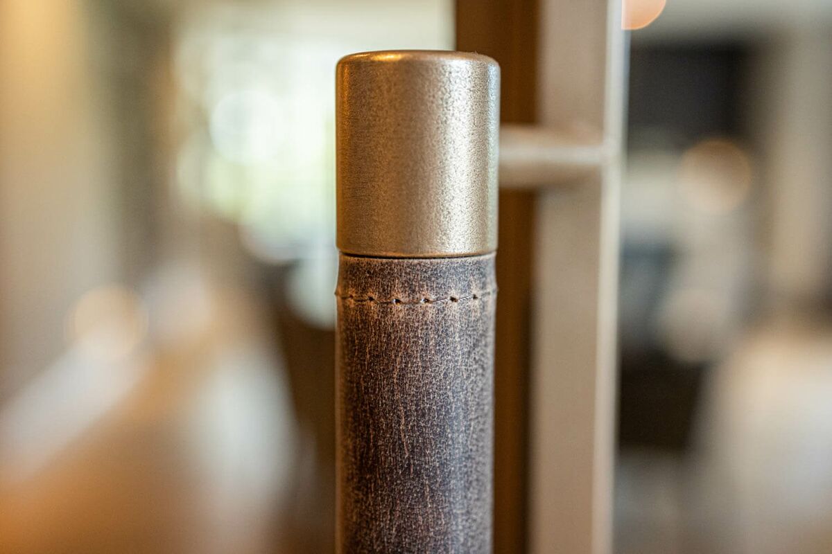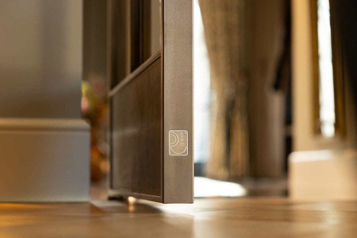 Het hoogwaardige leer van de deuren zorgt voor een royale uitstraling. Dit sluit geheel aan bij de luxe woonkeuken. De deuren zijn uitnodigend en verzorgen en warm welkom. Dit komt onder meer door de gekozen Taut vlakverdeling en de gepatineerde bronslaag. Bij het maken van de deuren kijken we naar de kleinste details. Zo is zelfs het rozet van de deur in dezelfde kleur als de deur zelf. Dit befaamde mechanisme van FritsJurgens staat bekend om zijn duurzame eigenschappen.