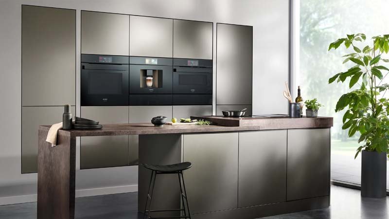 De Metal Chic-keuken belichaamt de toekomst van design: stijlvol, functioneel en technologisch vooruitstrevend. De nieuwste generatie keukenapparatuur integreert naadloos in het ontwerp met slimme functies zoals stoomprogramma’s, baksensoren, energie-efficiënte systemen en bediening via apps. Afzuigsystemen verdwijnen in het plafond of in het kookeiland en versterken het gevoel van rust en ruimte. Gekleurde glazen fronten voegen een high-end uitstraling toe die perfect past bij de moderne esthetiek van deze trend.