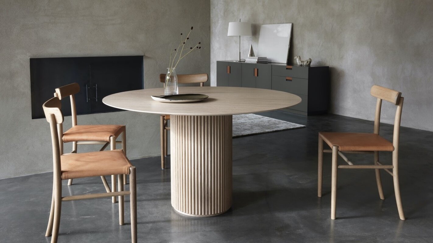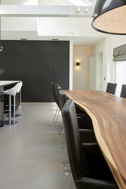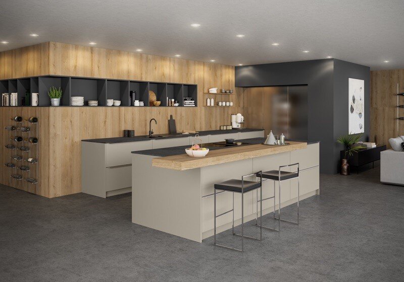 Hout wordt binnen deze trend op een verfijnde manier toegepast: als keukenfront, maar ook als wanddecoratie in de vorm van houtfineer met een duidelijk zichtbare nerf. In combinatie met leemgestucte wanden en rustige vloeren in beton- of natuursteenlook ontstaat een ingetogen, luxueuze basis. De kracht zit in de gelaagdheid van structuren. Grafische ribbels, grove houtstructuren en voelbare steenoptieken wisselen elkaar af en geven het interieur een ambachtelijke, bijna tastbare kwaliteit. Designmeubelen met een eigen signatuur, zoals een markante open kast of een ronde eettafel, maken de keuken persoonlijk en levendig.