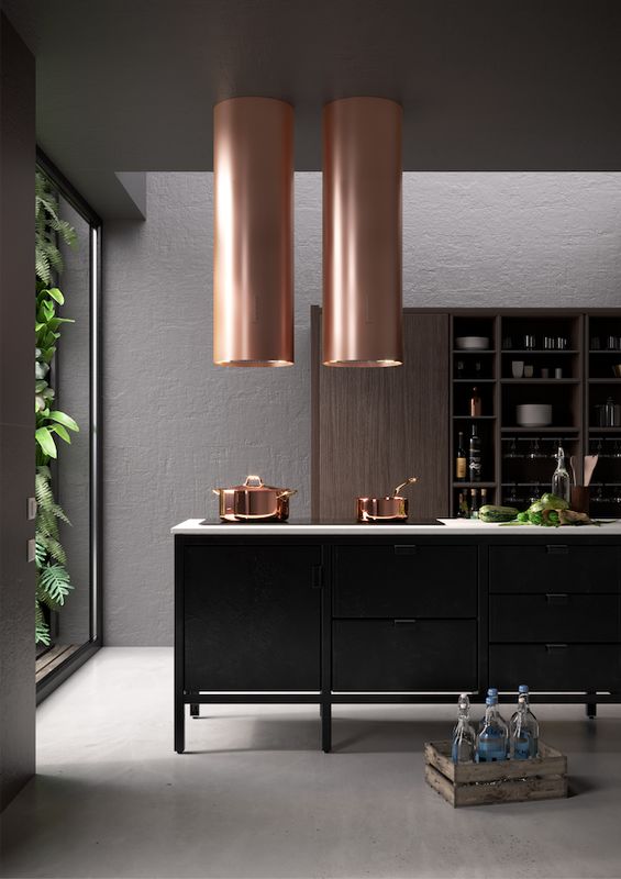De cilindervormige afzuigkap is in wit, zwart, goud- en koperkleurige lak verkrijgbaar.