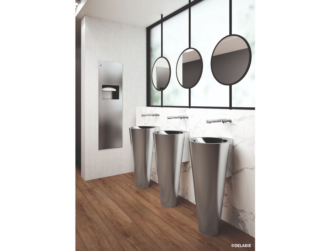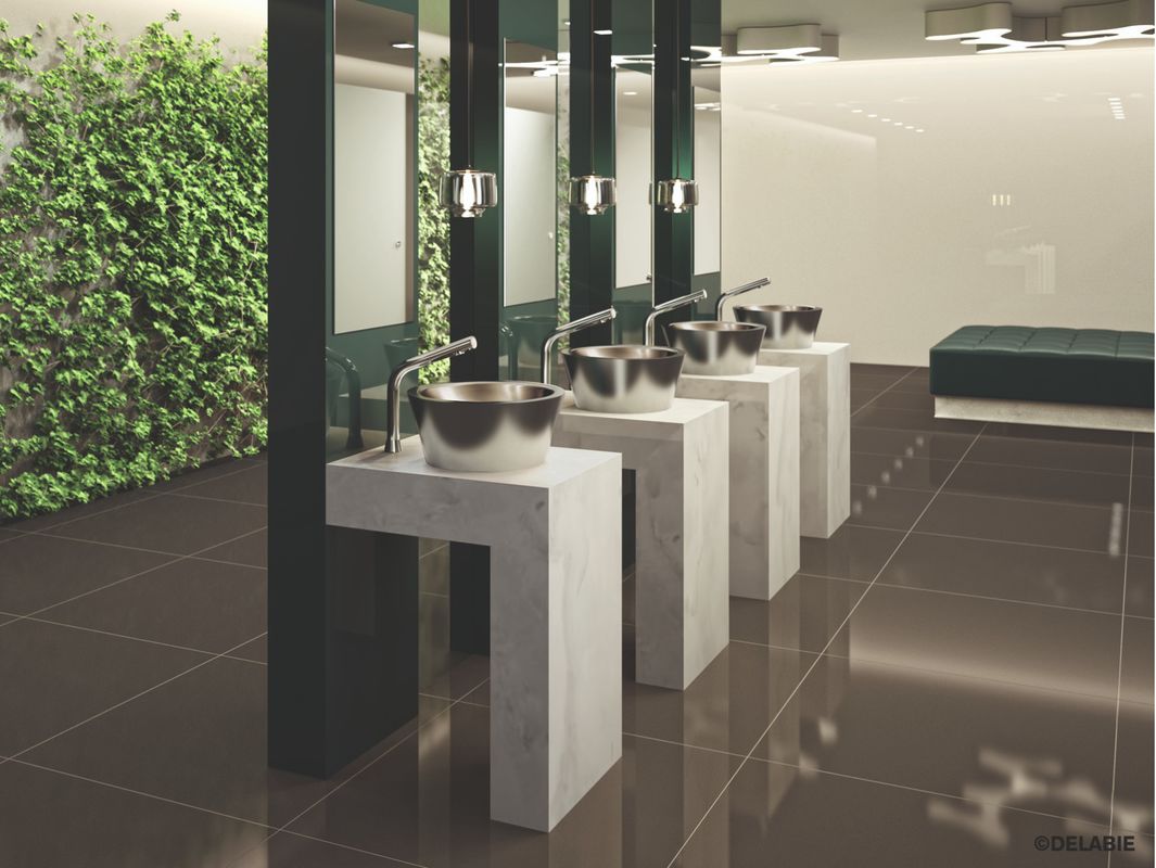 Het gebruik van roestvrij staal is nog een uiting van de designtrend bij Delabie. Onder haar assortiment sanitair in rvs is de nieuwe ALGUI wastafel een echt decoratief element voor de top-of-the-range wasruimte, met de dubbele afwerking glanzend/mat gepolijst die perfect integreert in elke stijl. Rvs ontwikkelt in de loop der tijd een patina, die bijdraagt tot de sfeer in de ruimte.