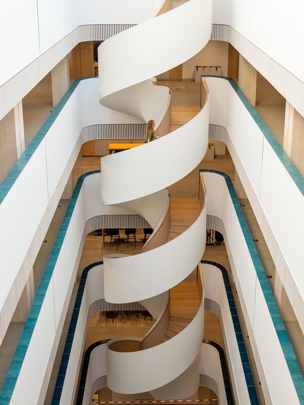 Niet vreemd dus dat Asona de opdracht kreeg in het meedenken aan en de uitvoering van een duurzame akoestische oplossing ter optimalisatie van de ruimteakoestiek. Daarbij speelde niet alleen de duurzaamheid van de materialen een grote rol, maar ook het ruimtelijk ontwerp. Er is door de architect van dit bijzondere gebouw gekozen voor veel ronde vormen en een spiraalvormig trapgat, hetgeen een uitdaging vormde voor de toepassing van een functioneel geluidsabsorberende oplossing voor zowel de plafonds als op de wanden.